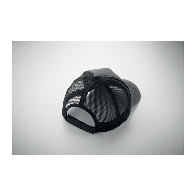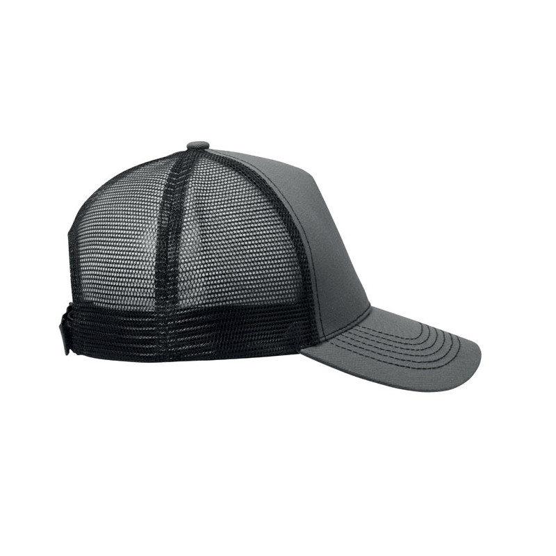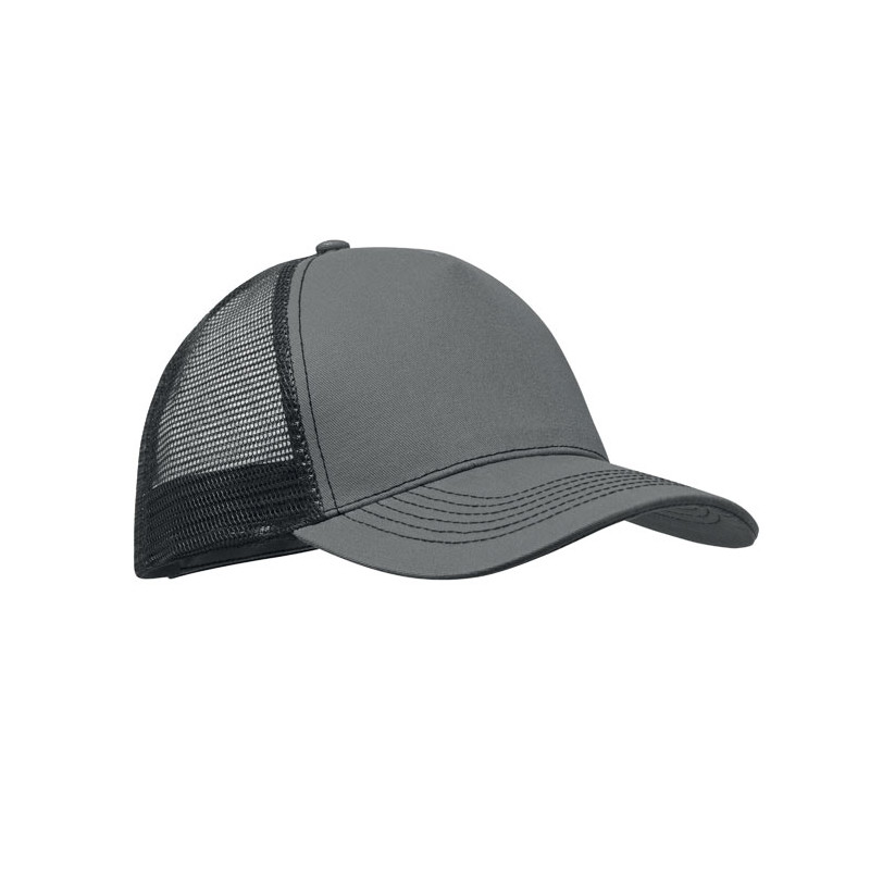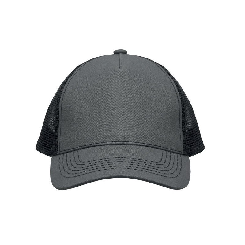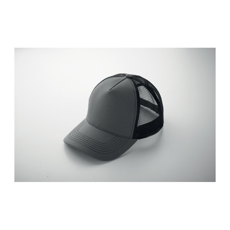 Gorra trucker de 5 paneles con panel frontal y visera en algodón de 250 gr/m², malla trasera en poliéster, cierre de gancho y bucle.