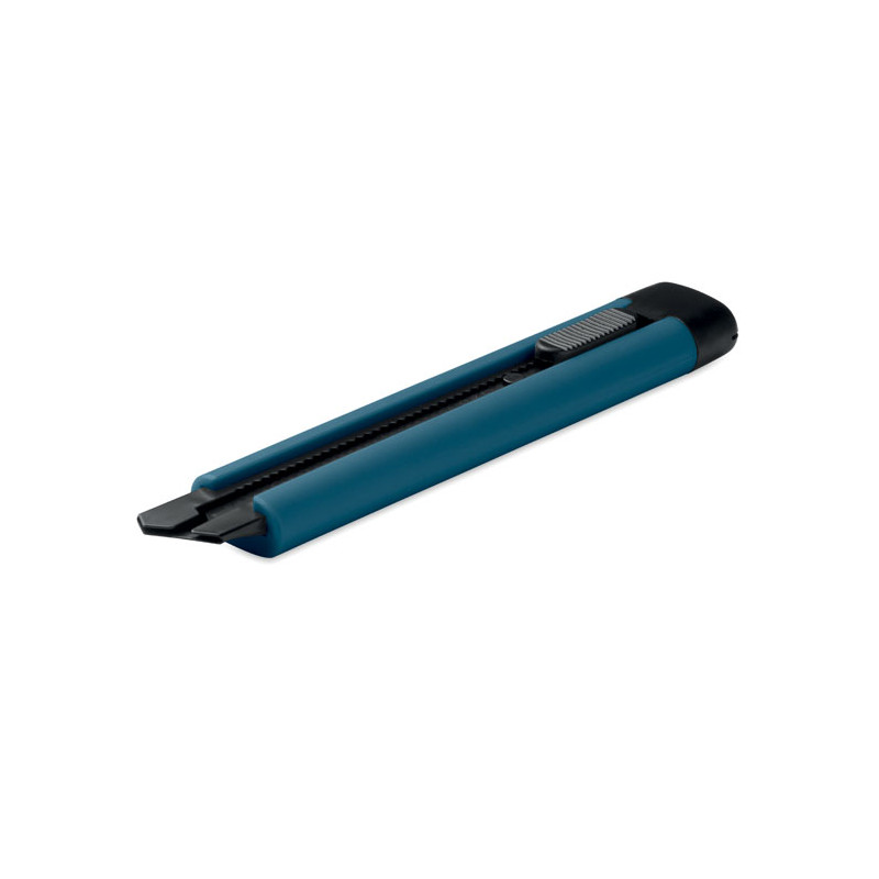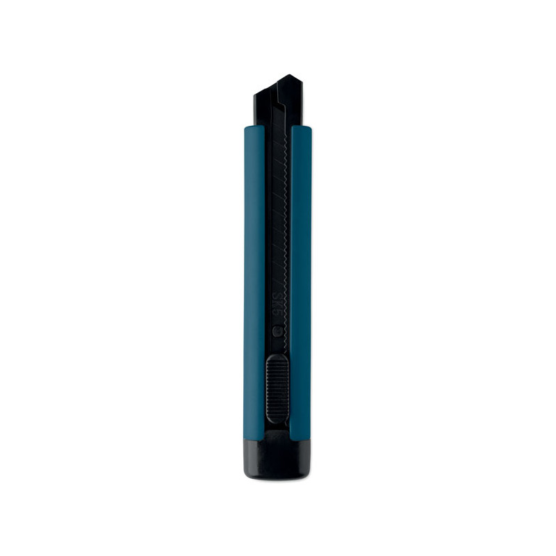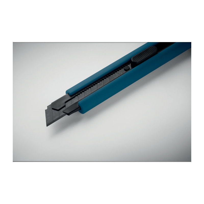 Cúter retráctil en ABS con cuchilla de acero al carbono. Este regalo personalizado incluye dos cuchillas extra, siendo la herramienta ideal para promocionar su marca en logística y bricolaje.