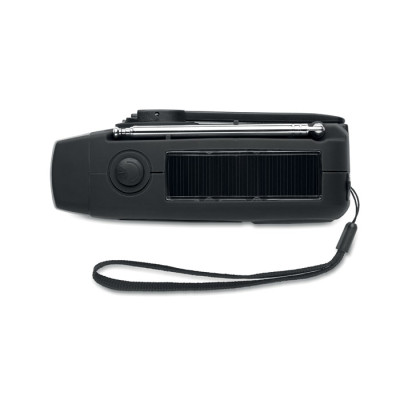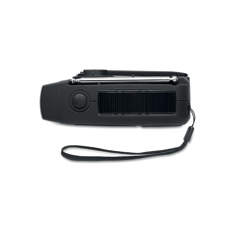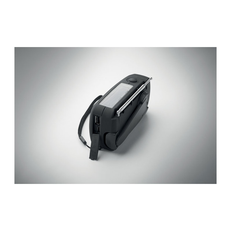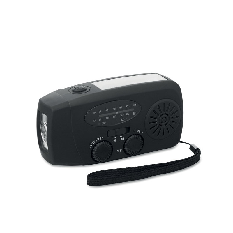 Radio AM/FM portátil en ABS con linterna LED (2 ajustes) y un power bank de 1200 mAh para carga de emergencia. Autoalimentado por energía solar y dinamo.