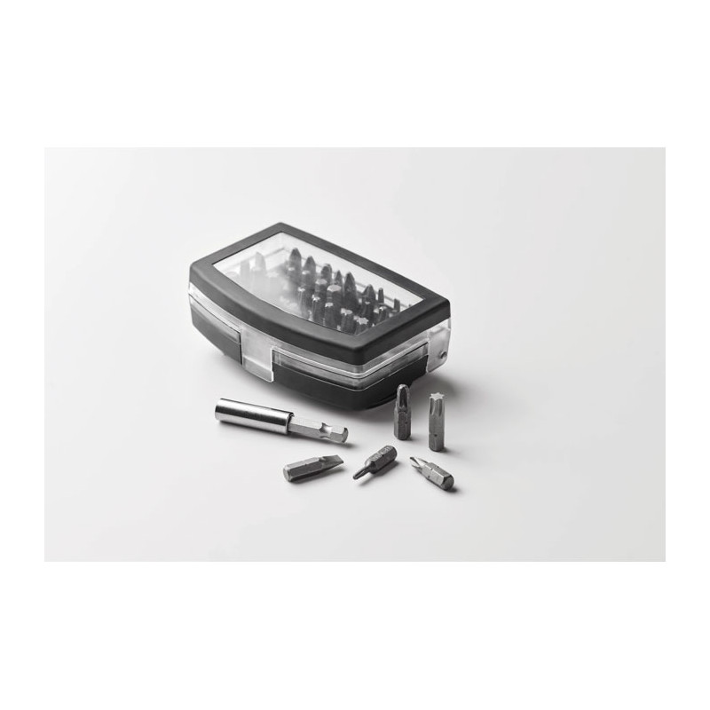 Set de 32 puntas para destornillador Screy para regalos personalizados. Incluye clips giratorios y es la solución perfecta para profesionales de mantenimiento y bricolaje.
