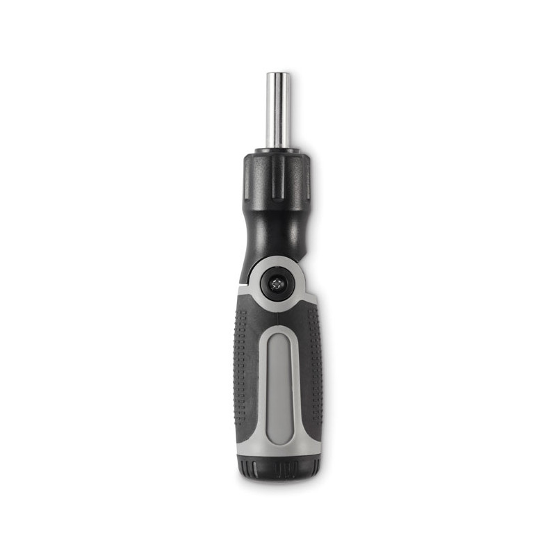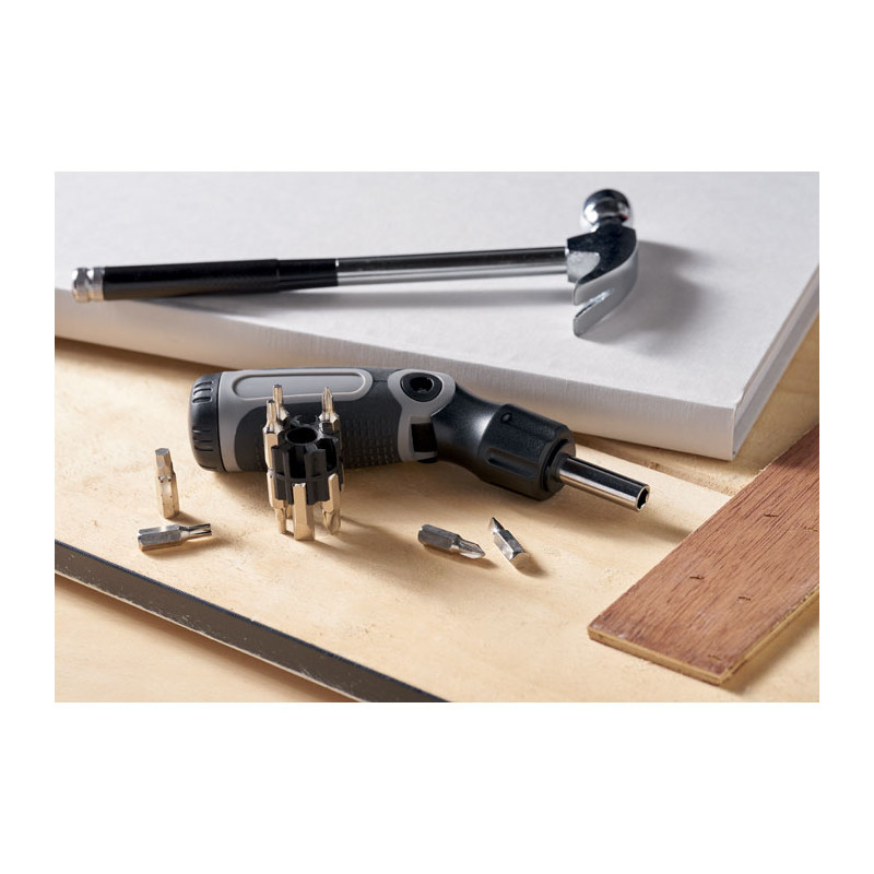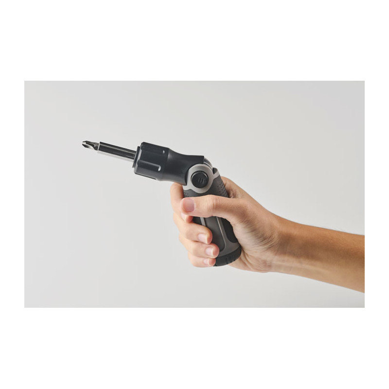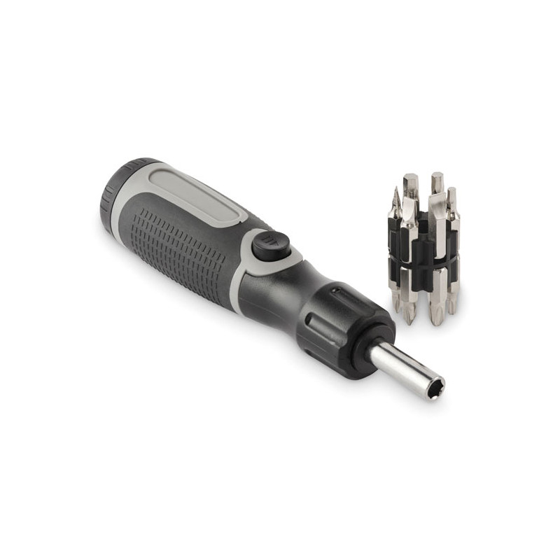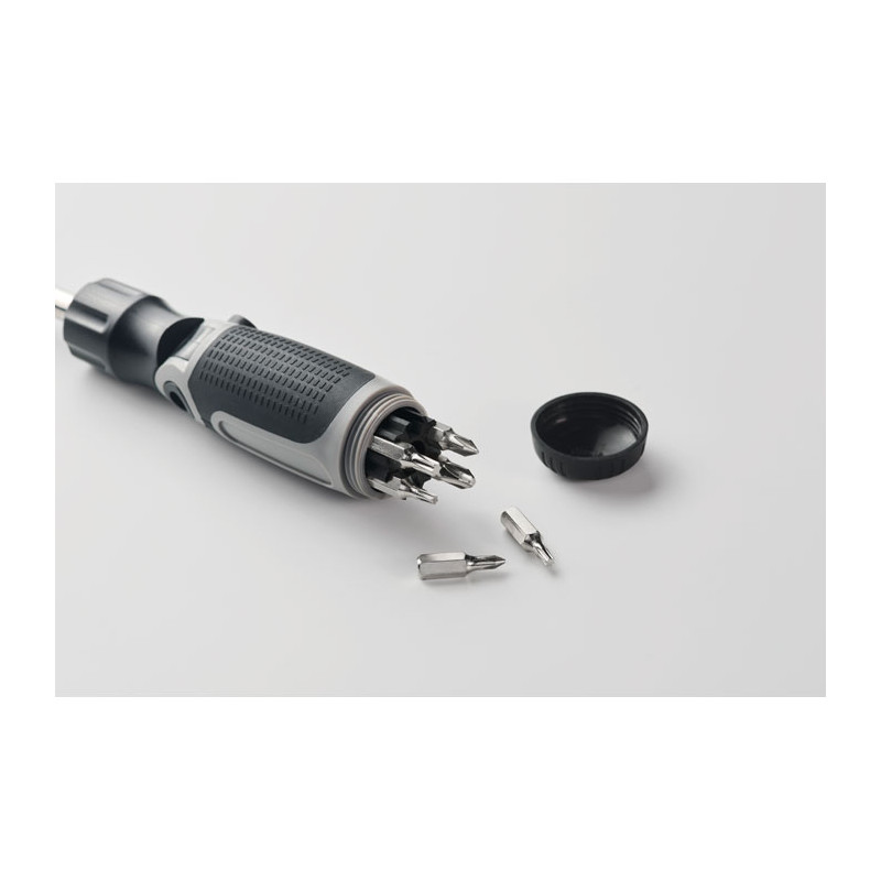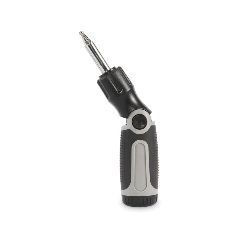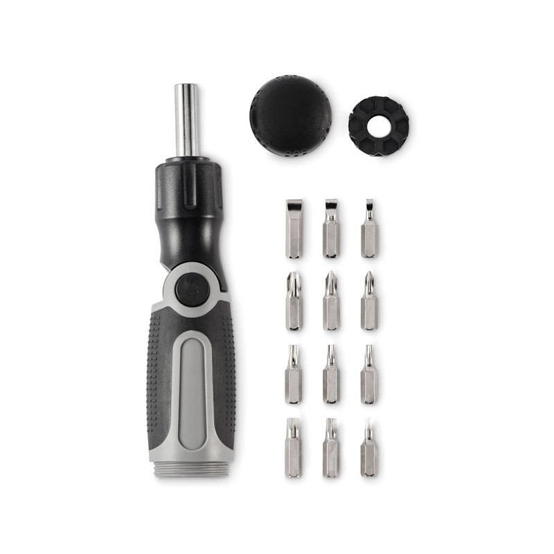 Set de destornilladores plegables con mango de ABS y 12 puntas de hierro que incluyen los tipos Phillips, de cabeza plana, hexagonal y torx.