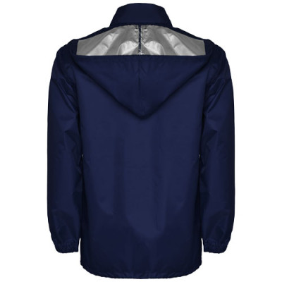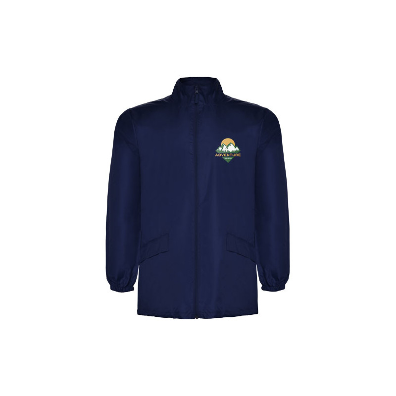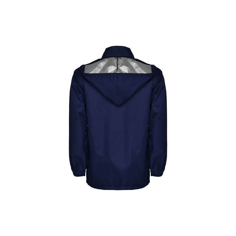 Chubasquero impermeable. Cuello alto y capucha plegable con cordón ajustable. Cremallera central a juego con el tirador. Dos bolsillos laterales con solapa. Puños elásticos. Goma elástica en el interior del bolsillo para su plegado y guardado. Resistente al agua. El modelo mide 185 cms y lleva la talla L.