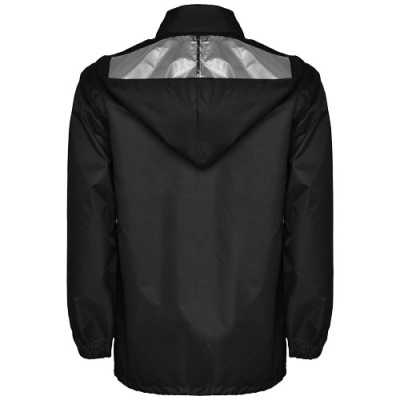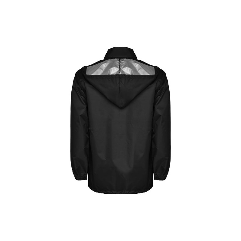 Chaqueta impermeable con capucha ajustable y cuello alto. Bolsillos con solapa, puños elásticos y cierre frontal. Personalizable con logotipo, ideal para regalos corporativos.