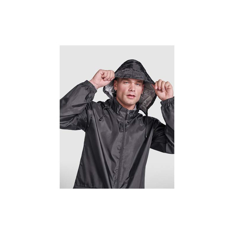 Chubasquero impermeable. Cuello alto y capucha plegable con cordón ajustable. Cremallera central a juego con el tirador. Dos bolsillos laterales con solapa. Puños elásticos. Goma elástica en el interior del bolsillo para su plegado y guardado. Resistente al agua. El modelo mide 185 cms y lleva la talla L.