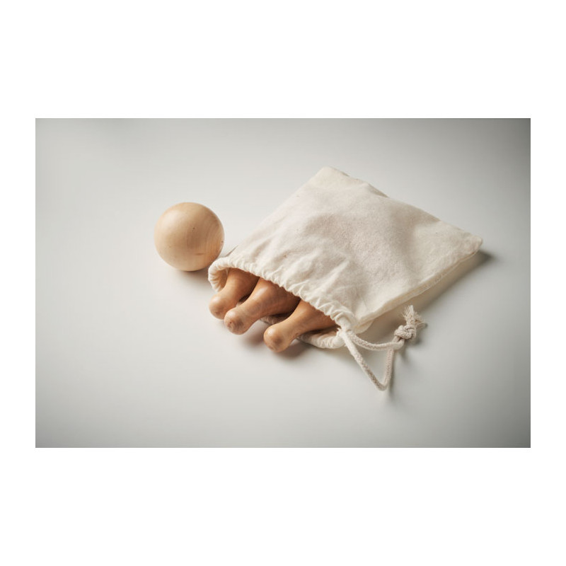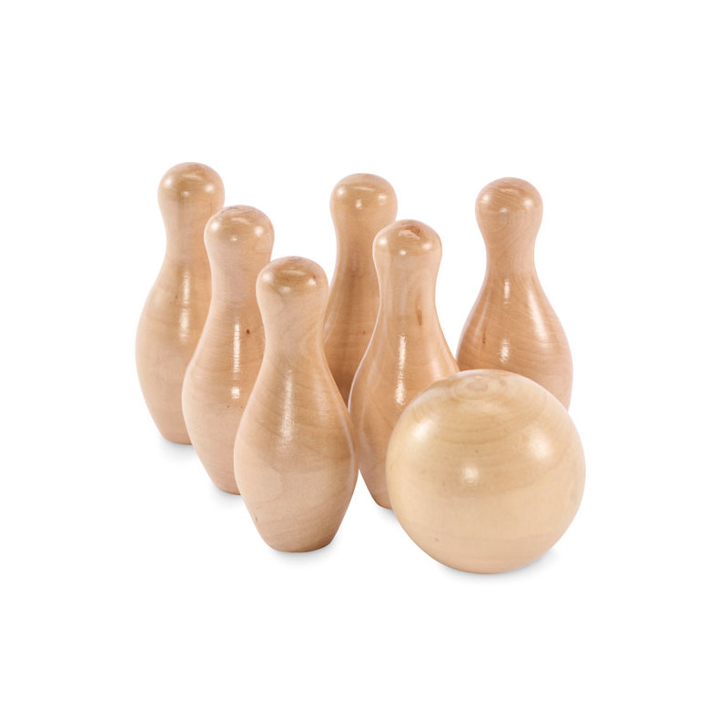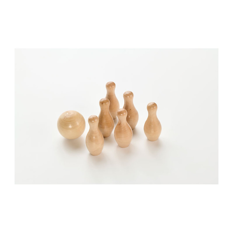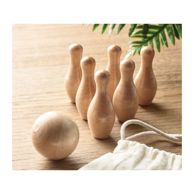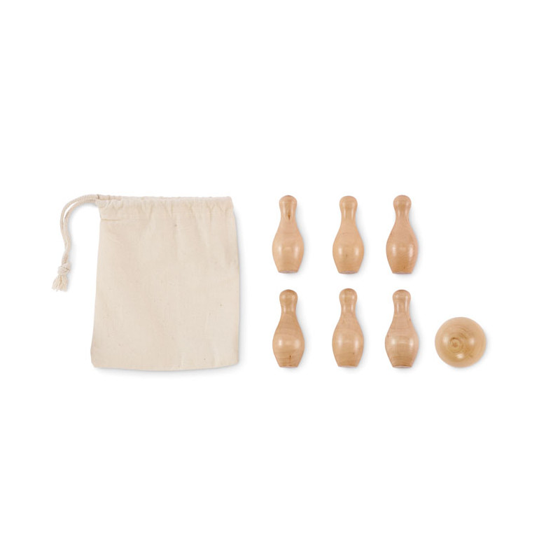Mini juego de bolos en madera de pino presentado en bolsa de algodón con cordón. Incluye 6 bolos y 1 bola. FSC®-certified | FSC 100%, W15.2, FSC-C213206