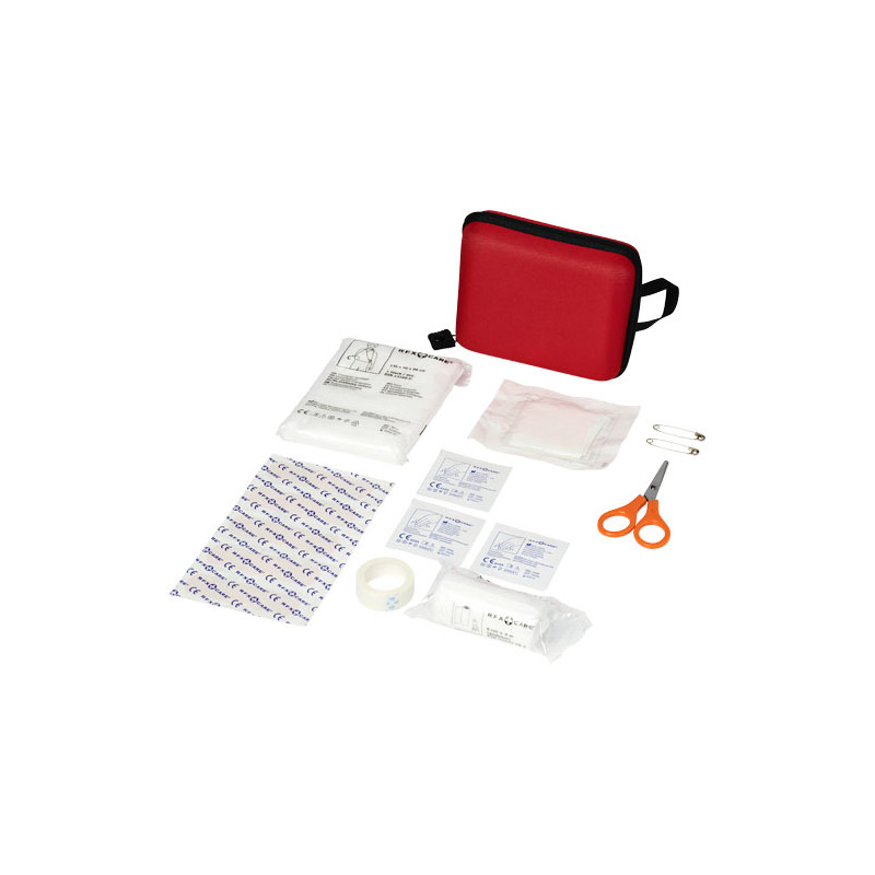 Bolsa de EVA con 4 almohadillas de alcohol, 1 esponja no tejida, 5 apósitos adhesivos, 1 cinta de papel, 1 venda, tijeras, 2 imperdibles y 1 venda triangular. Según EN13485.