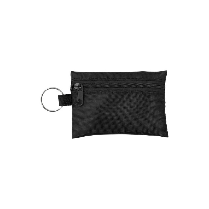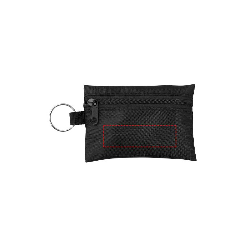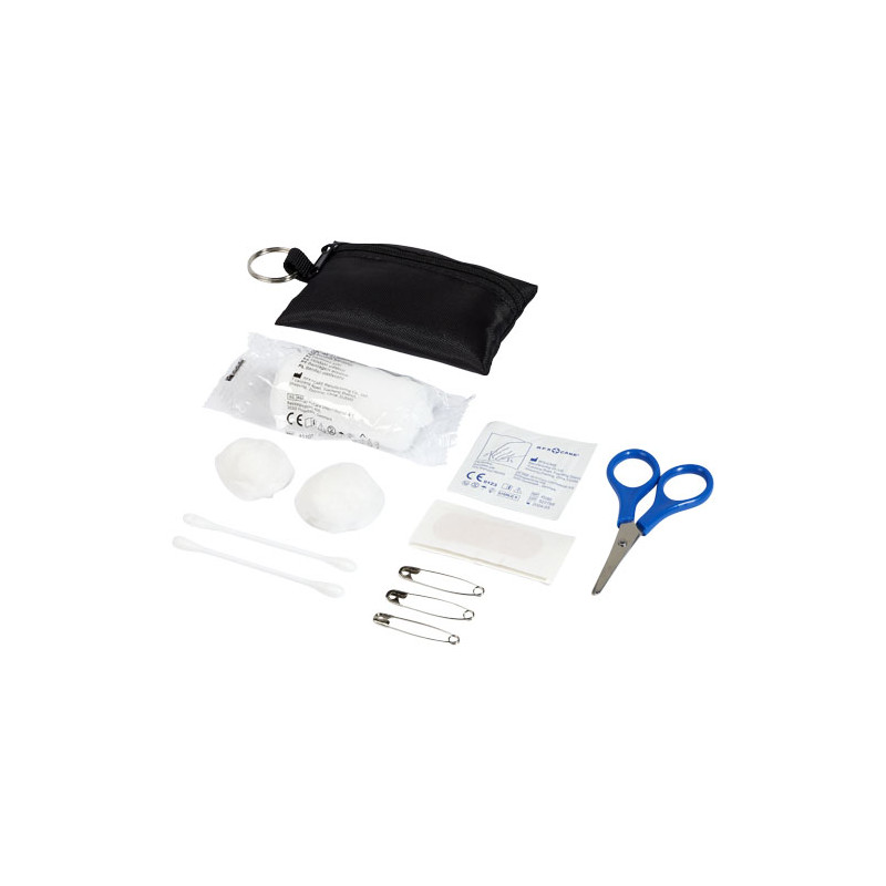 Práctica funda de poliéster con llavero que contiene 16 elementos de primeros auxilios. El kit contiene un par de tijeras (9 cm), 2 toallitas limpiadoras , 1 venda elástica (4 metros x 6 cm), 2 bolas de algodón (0,5 g), 3 imperdibles (3,6 cm), 5 tiritas (45x19 mm) y 2 bastoncillos (8 cm). Ideal para viajes, festivales, eventos y otras actividades al aire libre. Además, cuenta con una amplia zona de decoración. Un botiquín de primeros auxilios se considera un producto sanitario y se rige por la Directiva 93/42/CEE, en función del uso previsto: «Diagnóstico, prevención, control, tratamiento o alivio de enfermedades». Este dispositivo médico es de Clase I.