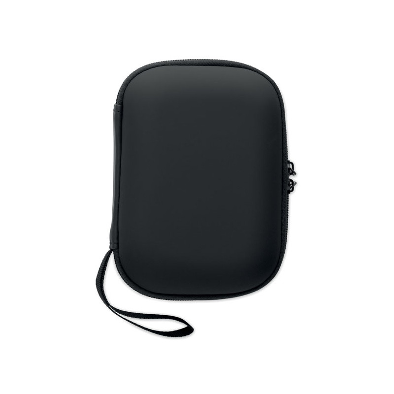 Botiquín primeros auxilios en estuche rígido de PU. Incluye 2 guantes, 1 manta, 1 esparadrapo, 2 vendas, 1 tijera, 4 bastoncillos, 10 tiritas y 6 toallitas. No disponible para la venta fuera de la UE.
