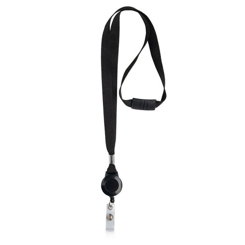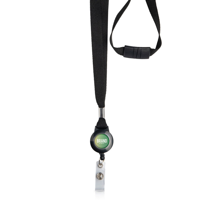 Lanyard Galy con porta credencial extensible. Lanyard contiene broche de seguridad y pieza especial para colocar credenciales. El titular de la credencial es extensible y se colapsa automáticamente.