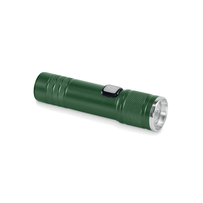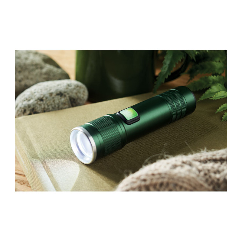 Linterna de luz COB recargable y extendible de aluminio reciclado. 100 lúmenes con 3 ajustes de luz y función de zoom. Batería recargable integrada de 800 mAh. Cable de carga incluido.