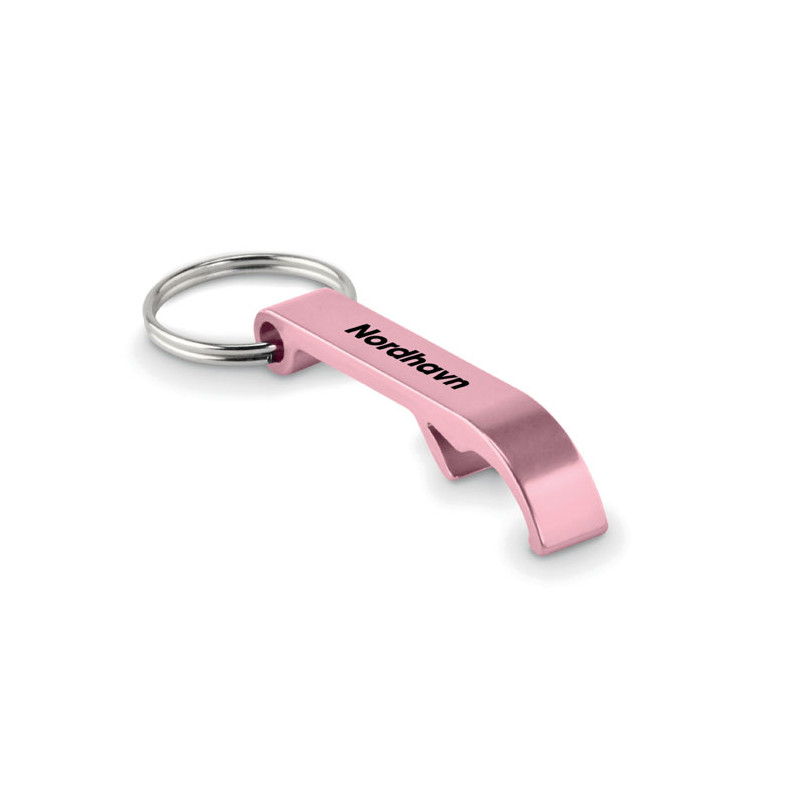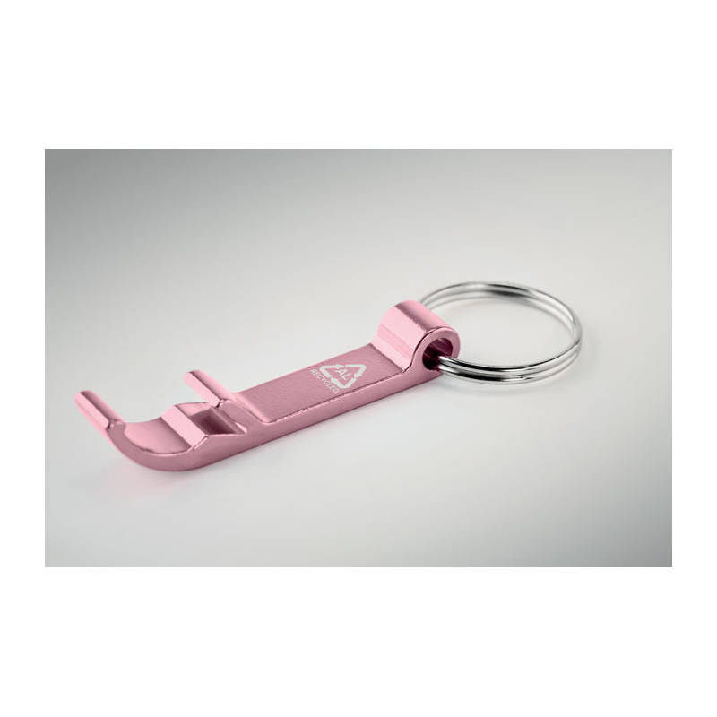 Abridor de botellas con llavero de aluminio reciclado en acabado brillante.