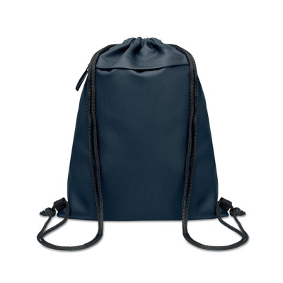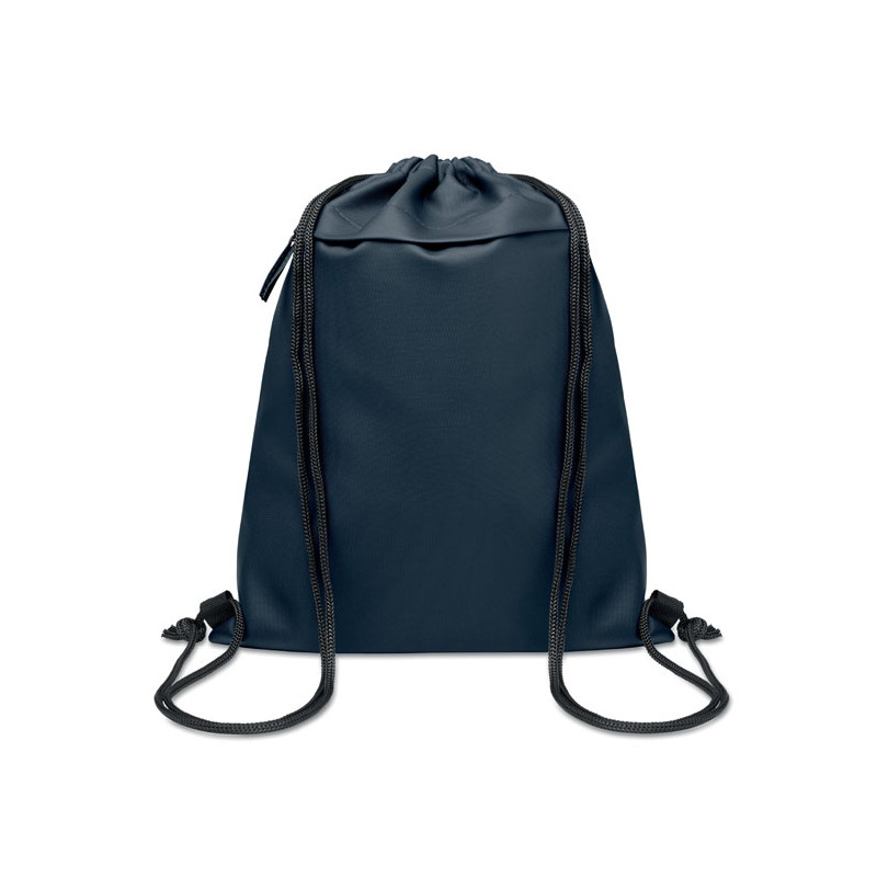 Bolsa de cuerdas de poliéster RPET 600D recubierto de PU y forro de poliéster RPET 190T. Bolsillo frontal con cremallera.