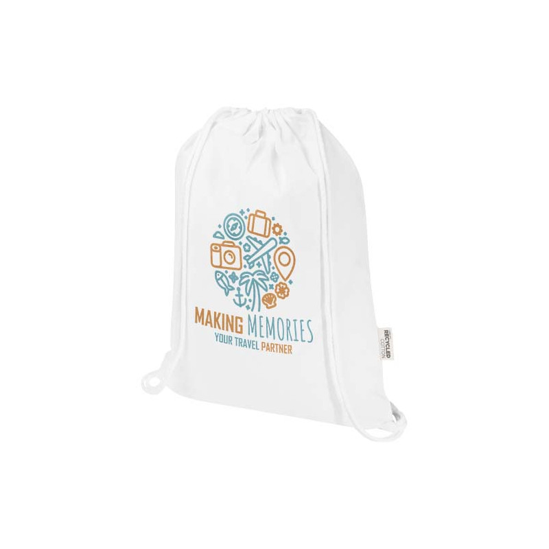 La bolsa con cordón fabricada en 60 % algodón reciclado con certificación GRS y 40 % PET "Oregon Blend" resulta ideal para potenciar tu marca o campaña de marketing. Esta bolsa ligera es económica y fácil de llevar a la espalda o al hombro, y dispone de espacio suficiente para añadir un logotipo u otros mensajes. El cordón facilita su apertura y cierre, y el material de algodón de 140 g/m² es resistente y duradero. Gran compartimento principal con cierre de cuerda de algodón. Los estampados disponibles para esta bolsa Tote también cuentan con la certificación GRS, lo que garantiza que toda la cadena de suministro es transparente y está certificada. Fabricada en la India. Resistencia para hasta 5 kg de peso. Capacidad: 5 litros.