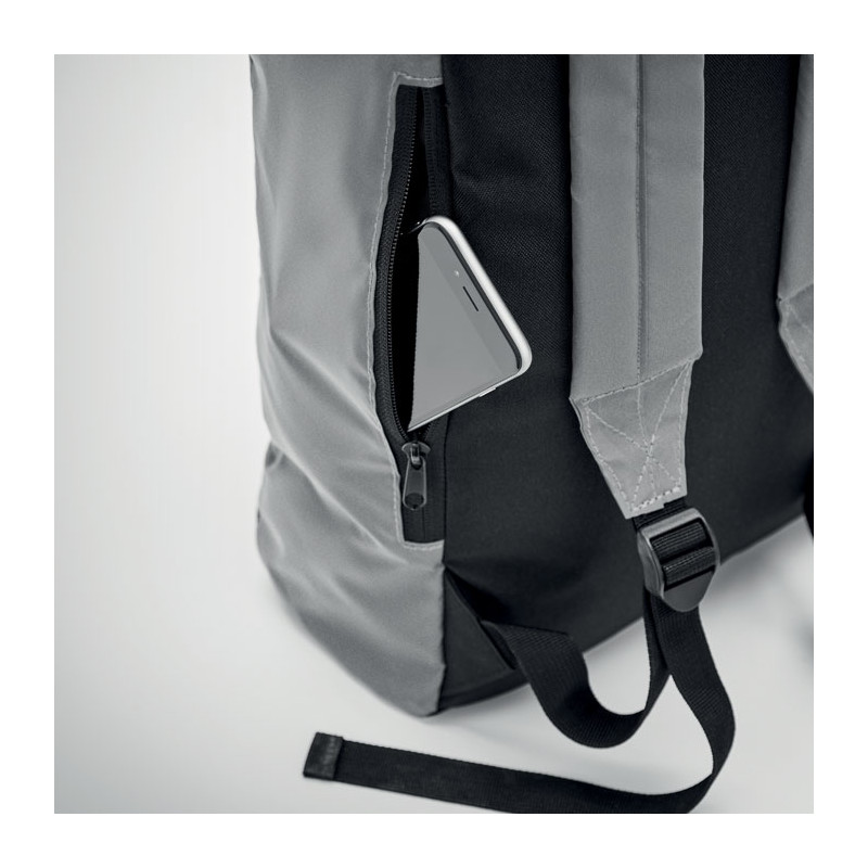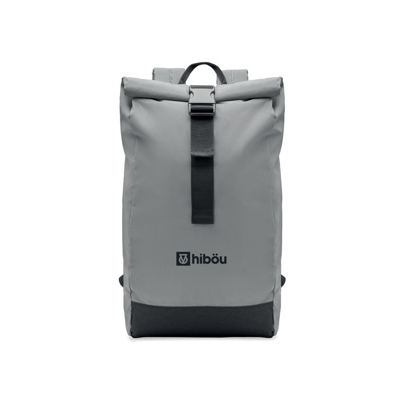 Mochila cierre roll top para portátil de 15'' en poliéster de 190T altamente reflectante. Lado interior adicional con cierre de gancho y bucle. Espalda, correas y parte inferior acolchadas. Bolsillo frontal con cremallera. Parte inferior en poliéster reciclado 600D.