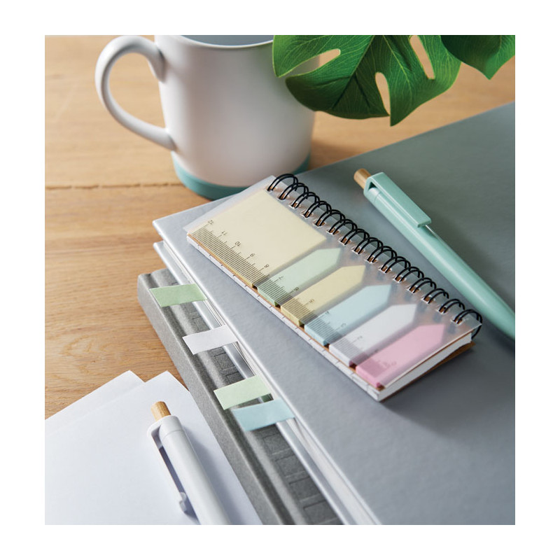 Set de notas de anillas en PP con notas adhesivas y 5 marcapáginas de colores surtidos en papel reciclado.
