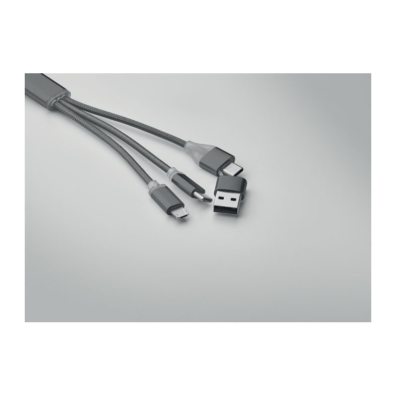 Brinde corporativo personalizable con logotipo y cuatro conectores. Ideal para gadgets, facilita al equipo y destaca tu marca con visibilidad promocional.