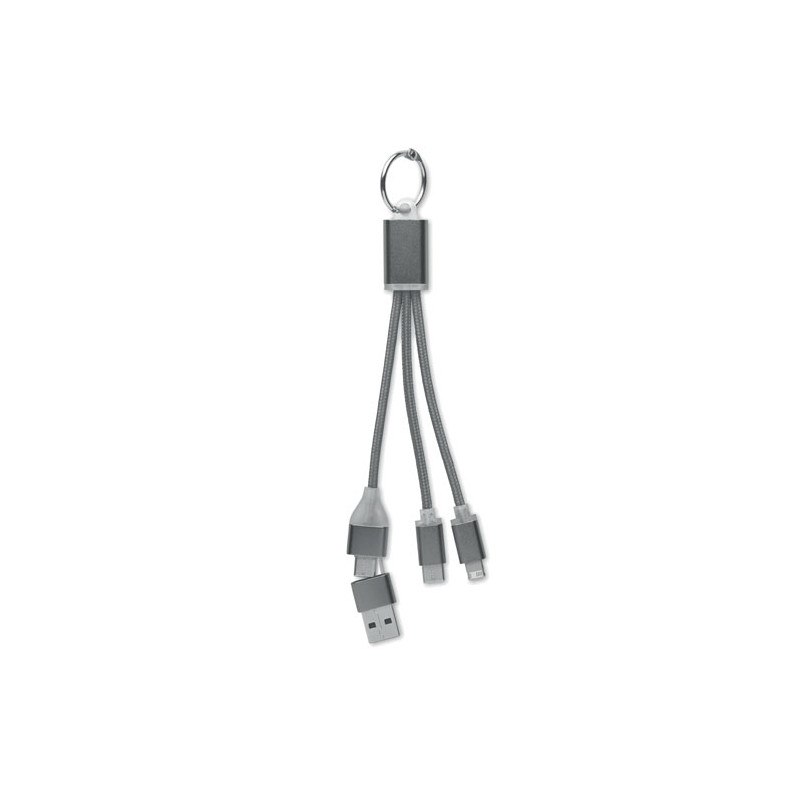 Llavero con cable de carga con entrada: 2 en 1 tipo-C y tipo-A y micro-B (2 en 1 clavija) y salida tipo C.