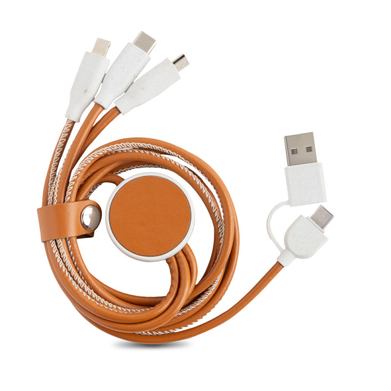 Cable 6 en 1 en ABS y PU reciclados. El estilo vintage está de vuelta y lo reciclado es tendencia. Con entradas USB/Type-C y salidas Micro-USB, Type-C e iOS. Sostenible, práctico y con mucho estilo