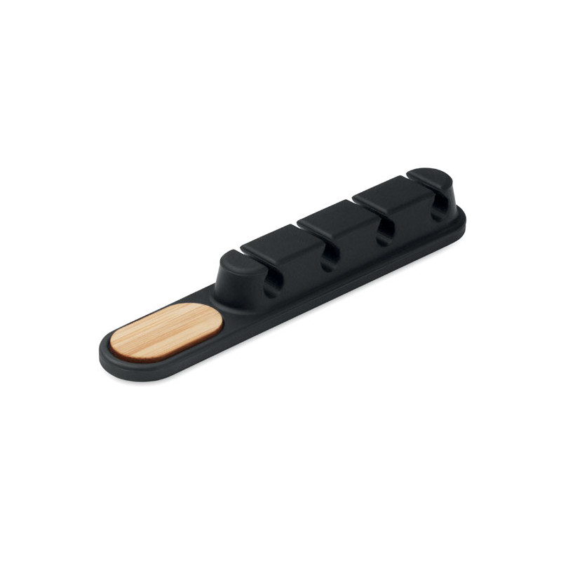 Organizador de cables de silicona con detalle de bambú natural. Su diseño ovalado y compacto mantiene los cables ordenados y seguros.