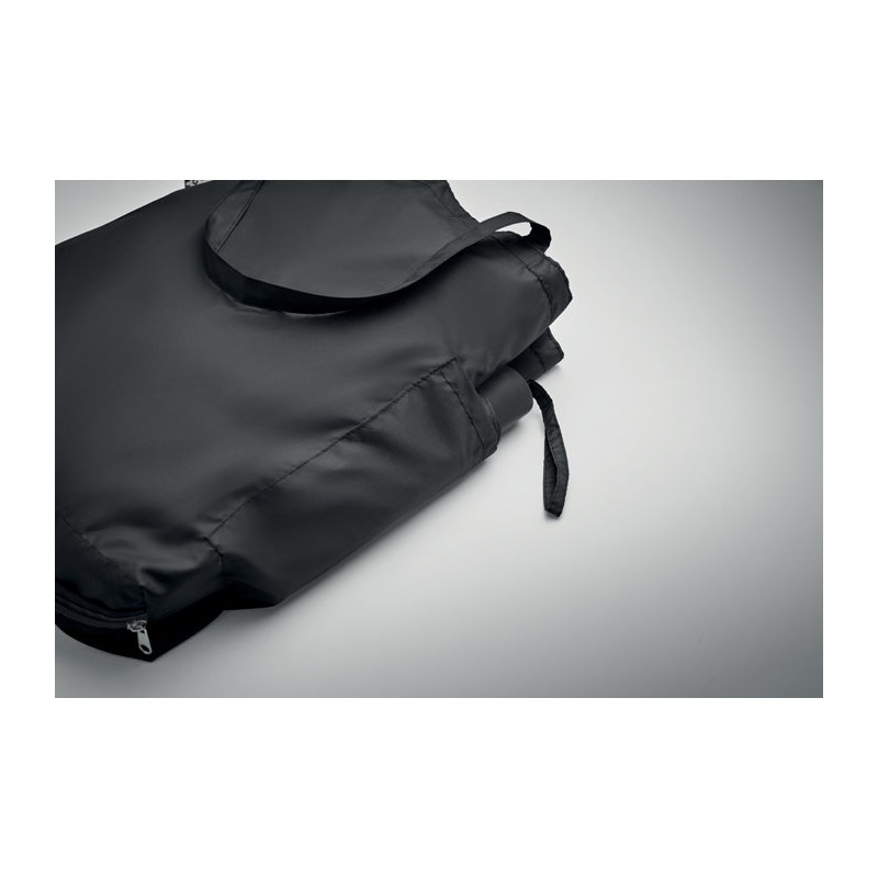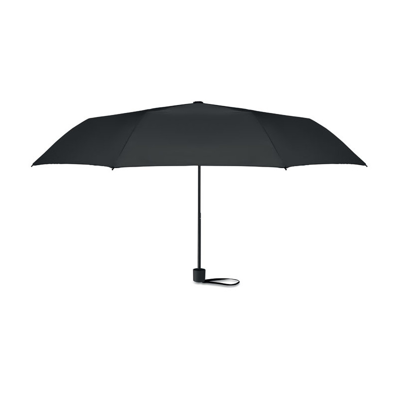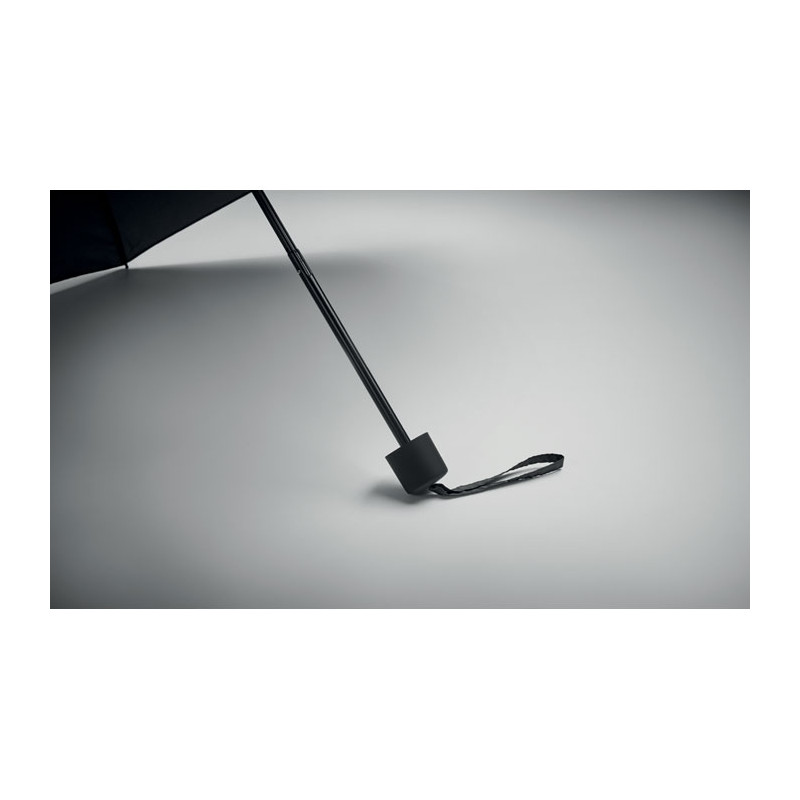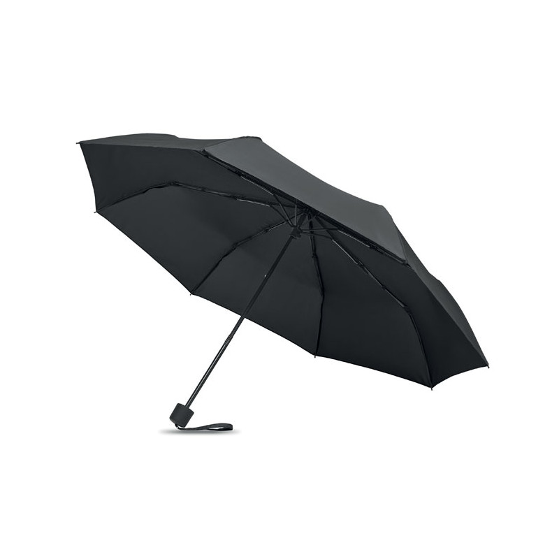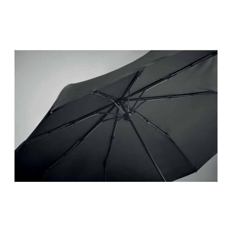 Paraguas antiviento de 21 pulgadas con 3 pliegues, apertura y cierre manual, en pongee RPET 190T. Incluye bolsa de la compra. Tiene un compartimento oculto con cremallera para guardar el paraguas y mantener seco el contenido de la bolsa. Cuando la bolsa no está en uso, se enrolla y el compartimento con cremallera actúa como funda para el paraguas.