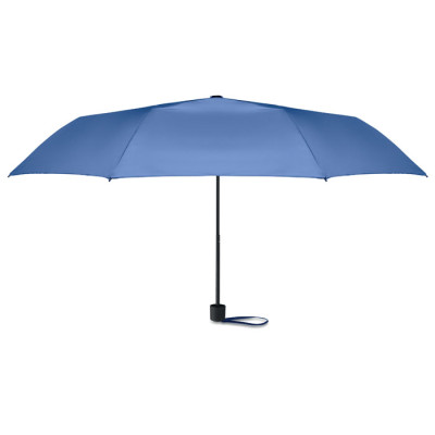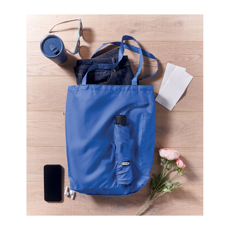 Paraguas antiviento de 21 pulgadas con 3 pliegues, apertura y cierre manual, en pongee RPET 190T. Incluye bolsa de la compra. Tiene un compartimento oculto con cremallera para guardar el paraguas y mantener seco el contenido de la bolsa. Cuando la bolsa no está en uso, se enrolla y el compartimento con cremallera actúa como funda para el paraguas.