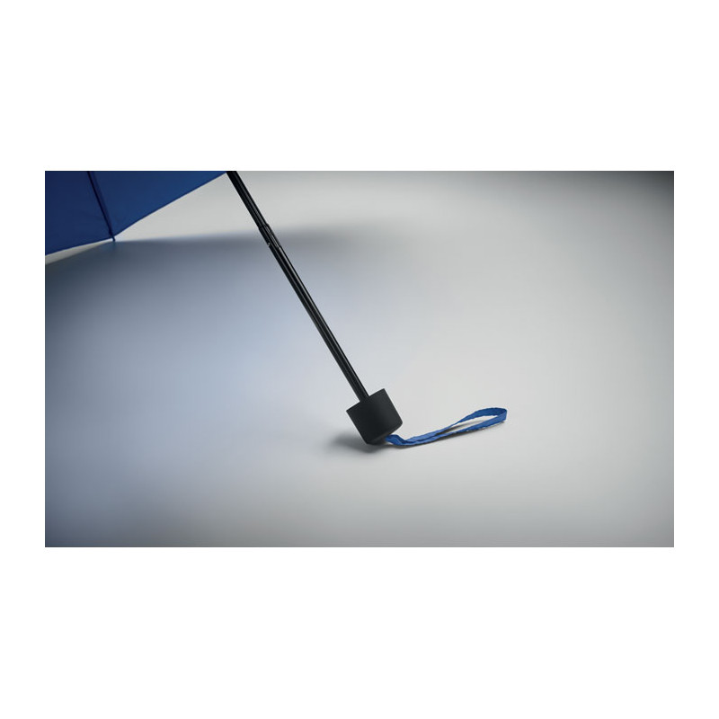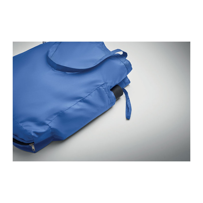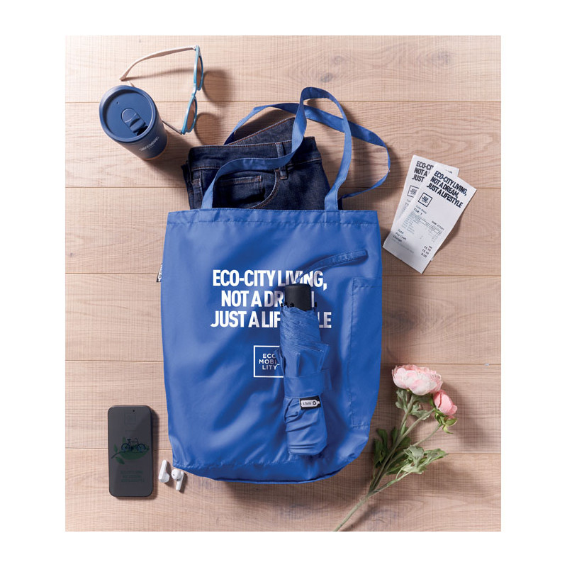 Paraguas personalizado en pongee RPET sostenible y resistente al viento. Diseño innovador con bolsa de compra integrada y compartimento oculto para transportar sus compras fácilmente.