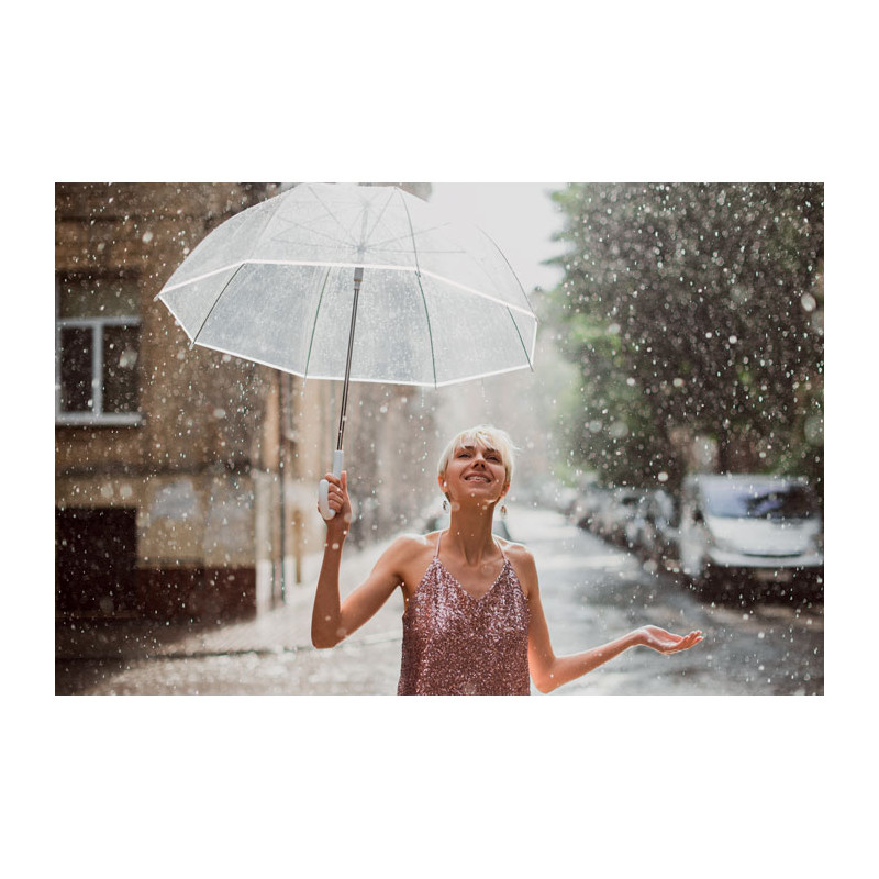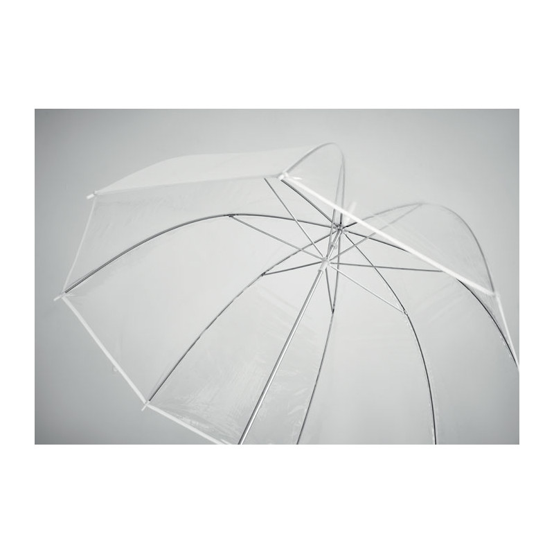Paraguas transparente de 23" en POE con panel de impresión en poliéster. El regalo personalizado ideal para eventos y marcas que buscan visibilidad moderna.