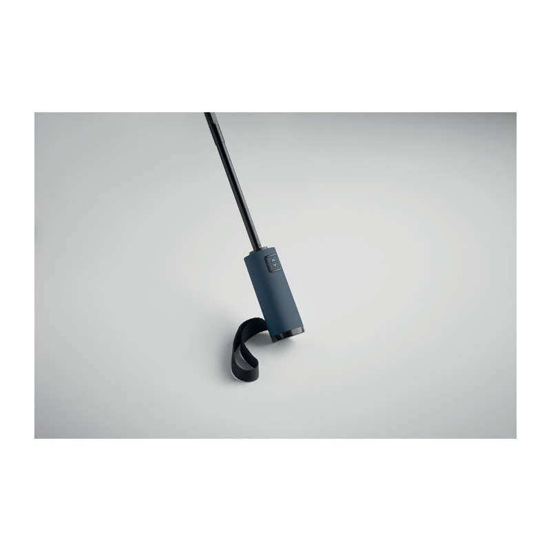Paraguas plegable antiviento automático de 23 pulgadas de pongee RPET de 190T y funda a juego. Estructura totalmente chapada en negro, varillas de fibra de vidrio y mango de ABS con acabado de goma.