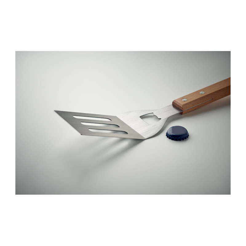 Espátula para barbacoa de acero inoxidable con mango de madera de haya y abrebotellas integrado. Incluye colgador de cuerda de PU para guardarla fácilmente.