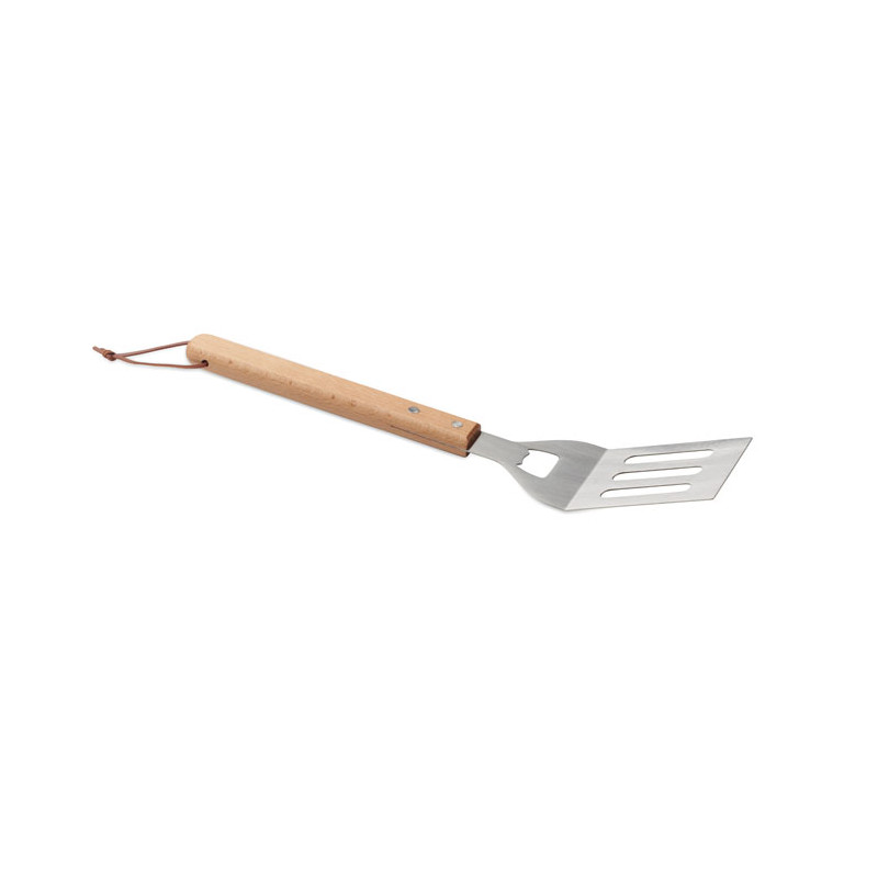 Espátula para barbacoa con mango de madera de haya resistente. Este regalo personalizado combina elegancia y funcionalidad, siendo ideal para marcas en eventos de gastronomía, ocio y aire libre.