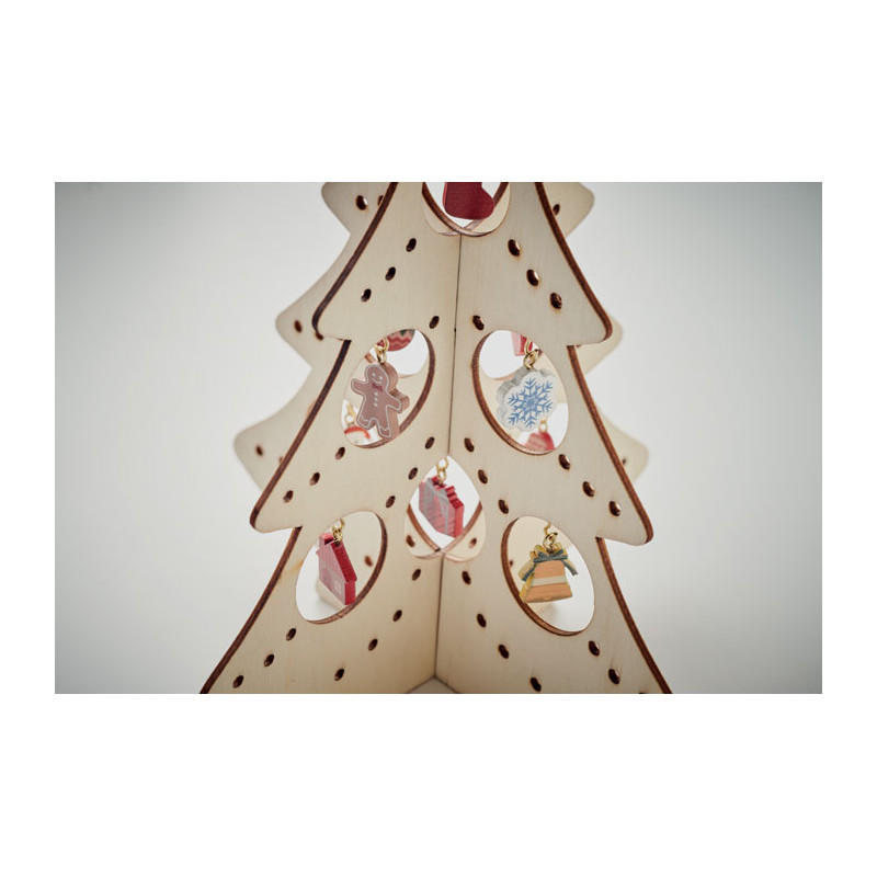 Adorno decorativo con forma de árbol de Navidad de madera contrachapada y 10 adornos variados. Requiere montaje.