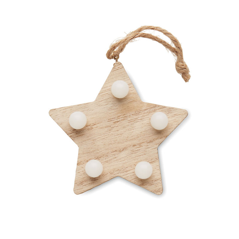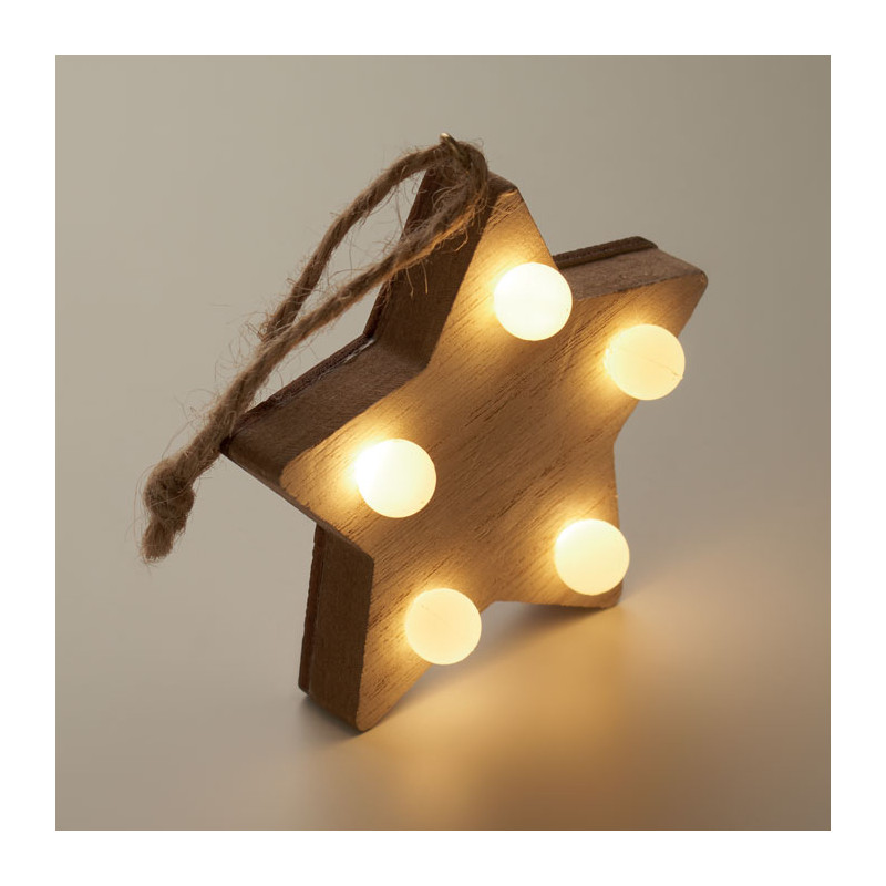 Estrella decorada de madera (80% madera de álamo y 20% madera de maleza) con luz de 6 LED y cuerda para colgar. Incluye 1 pila CR2032. La madera es un material natural, el color del articulo puede variar de unas piezas a otras.