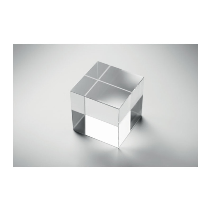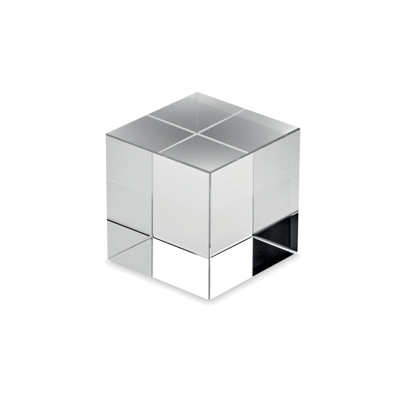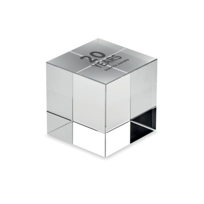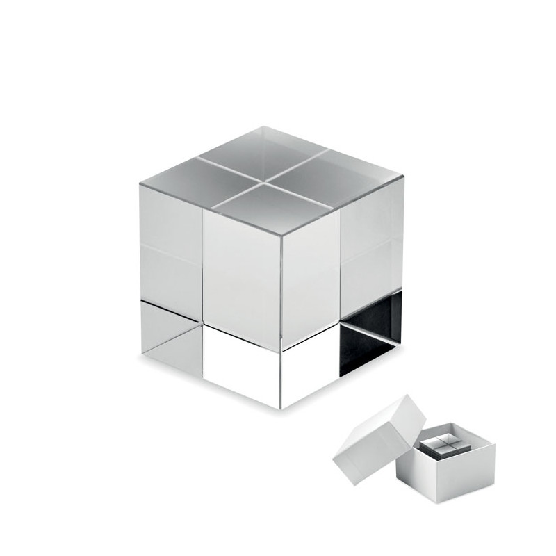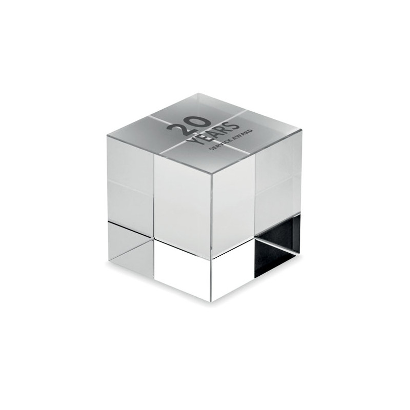 Premio o trofeo en forma de cubo de cristal. Presentado en caja de regalo.