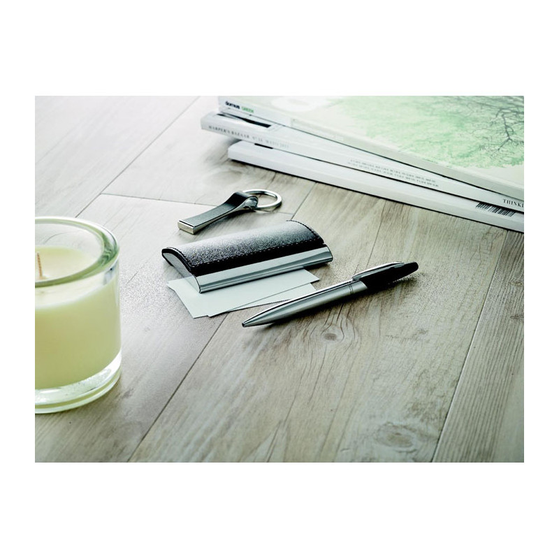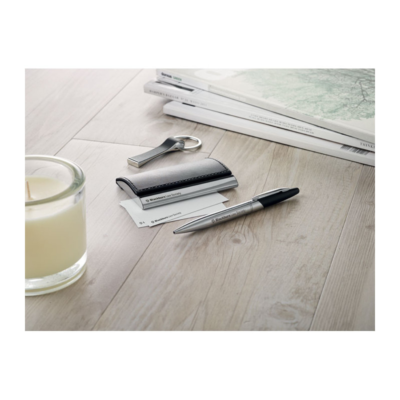 Set de regalo compuesto por bolígrafo metálico con tinta negra, llavero y tarjetero metálicos con combinación de PU.