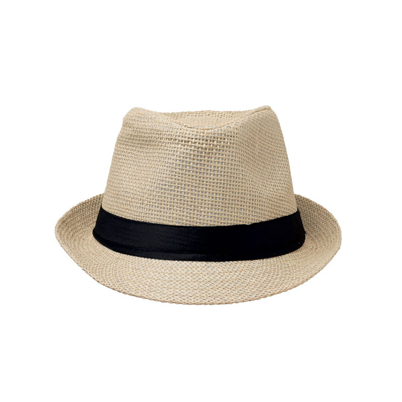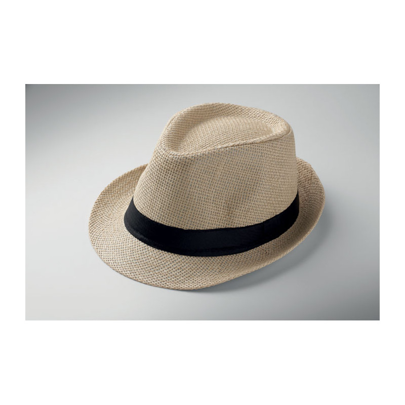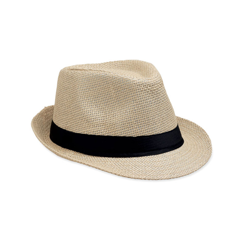 Sombrero de paja de papel con banda de poliéster negra. En los pedidos sin impresión, la cinta se servirá suelta y separada del sombrero.