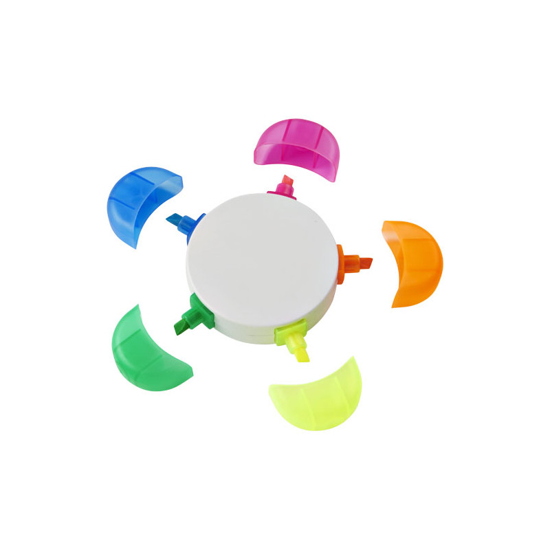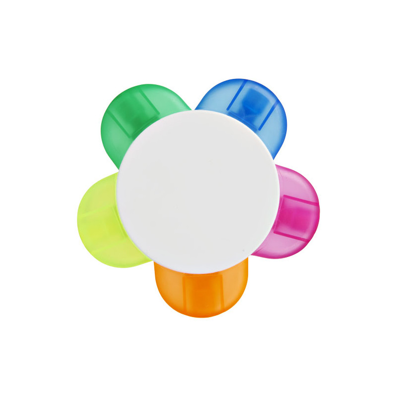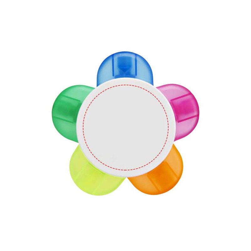 Marcador fluorescente en forma de flor, con cinco marcadores de colores en naranja, rosa, azul, verde y amarillo. ¡Advertencia! No apto para niños menores de tres años. Piezas pequeñas. Peligro de asfixia.