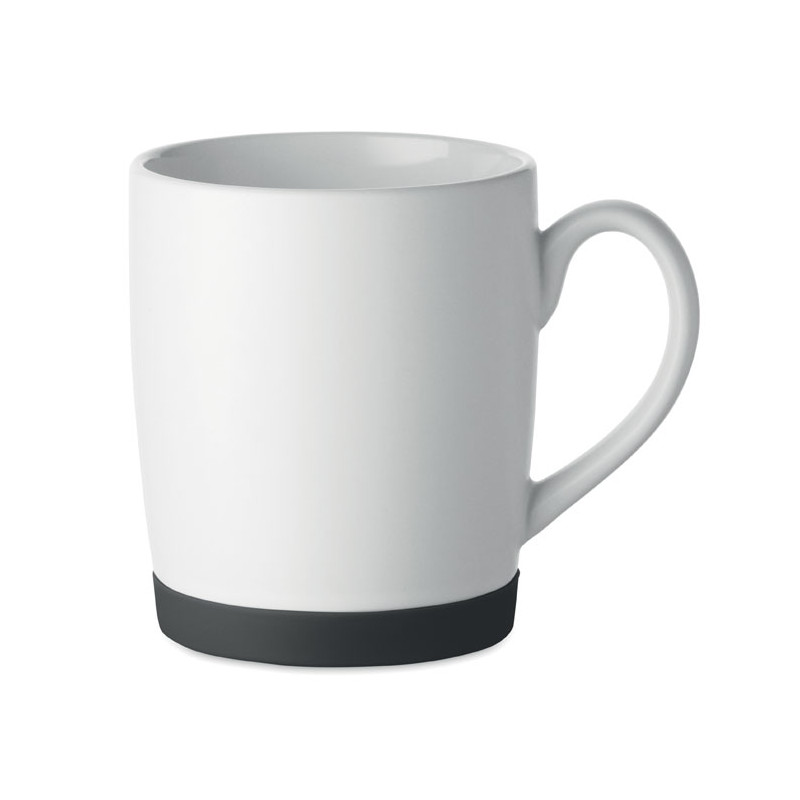 Taza de cerámica con acabado blanco mate y base de silicona para mayor estabilidad. Capacidad 300 ml. Embalaje individual en caja de cartón blanco.