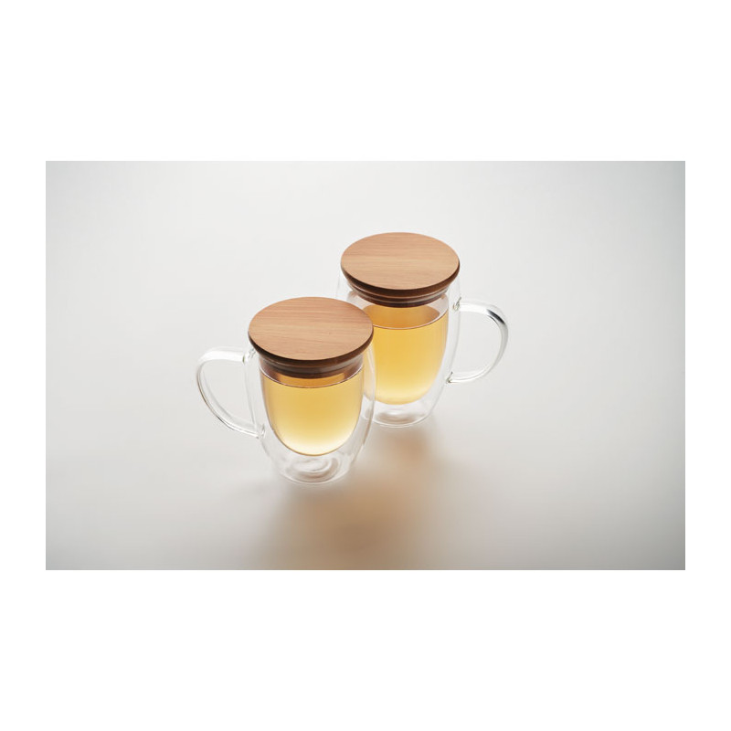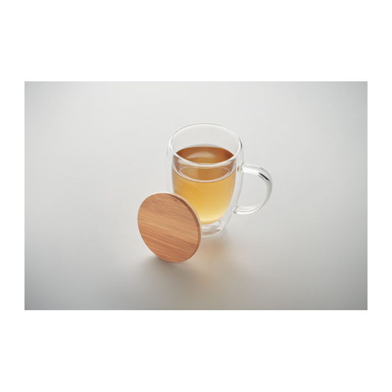 Taza de vidrio borosilicato de doble pared con asa y tapa de bambú. Capacidad: 250 ml.