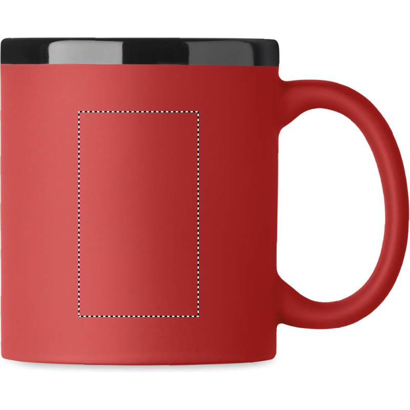 Taza de cerámica con revestimiento de tacto suave e interior/borde negros. Con un revestimiento especial para grabado láser. Capacidad: 300 ml. Embalaje individual en caja de cartón blanco.