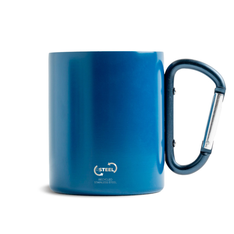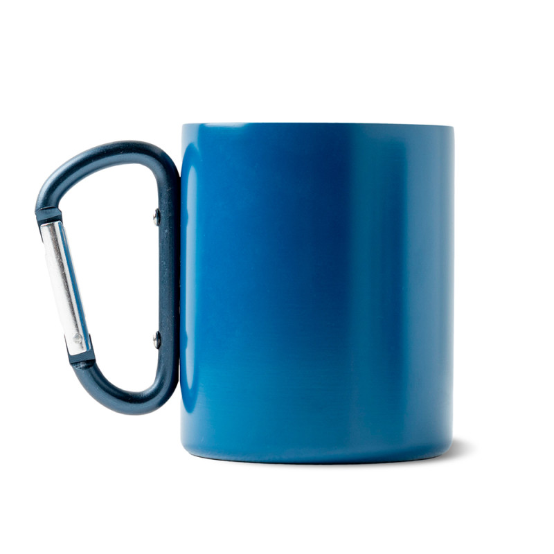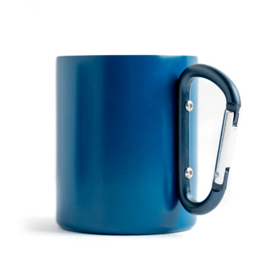 Taza de 300ml con aislamiento de doble pared y mosquetón integrado. Material resistente. Un regalo promocional práctico para camping y senderismo.