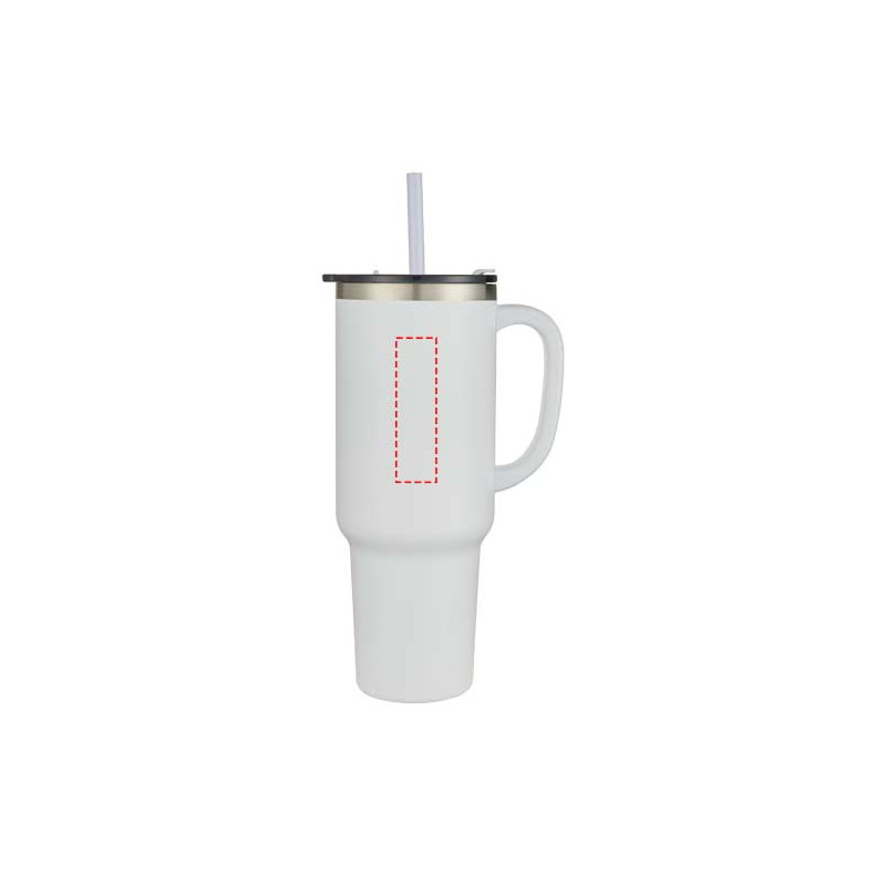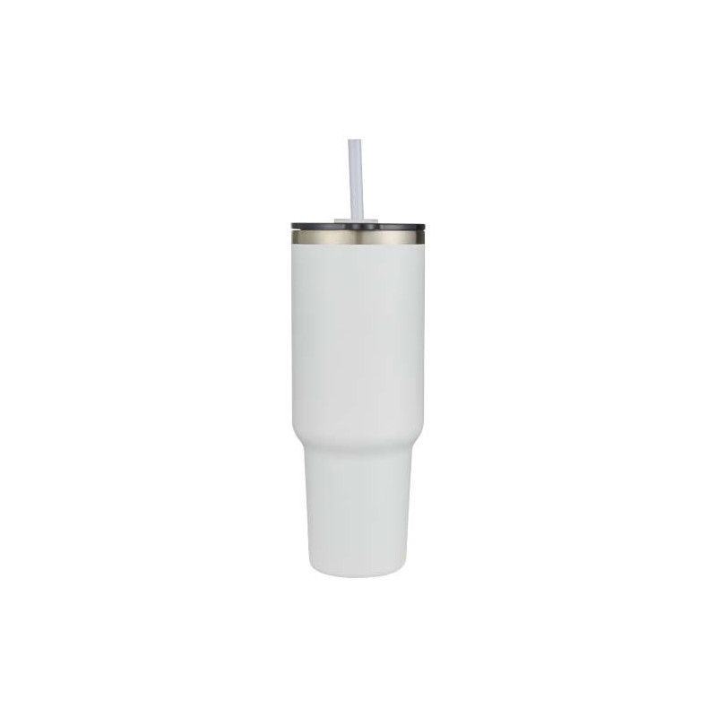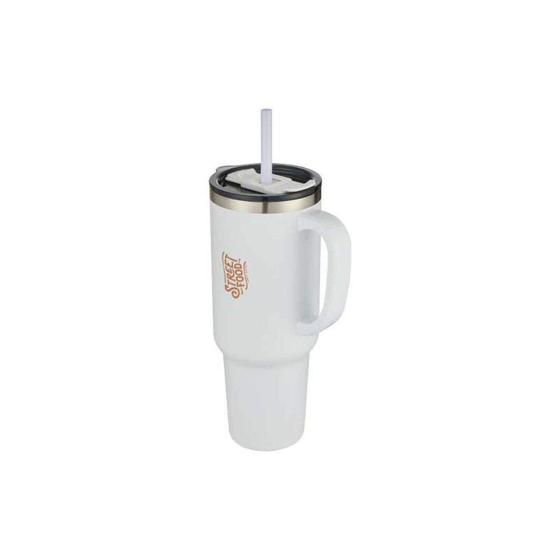 Vaso con aislamiento de cobre de doble pared y certificación RCS, fabricada con un 91 % de acero inoxidable reciclado posconsumo que mantendrá las bebidas frías durante al menos 24 horas y hasta 9 horas para las bebidas calientes. Incluye una pajita "Tritan" y una función deslizante en la tapa para evitar derrames. La tapa giratoria a presión de plástico 100 % reciclado mantiene la pajita en su sitio y puede girarse fácilmente para destapar la abertura para beber. Revestimiento pulverizado duradero. Capacidad: 1200 ml. Lavado a mano únicamente.