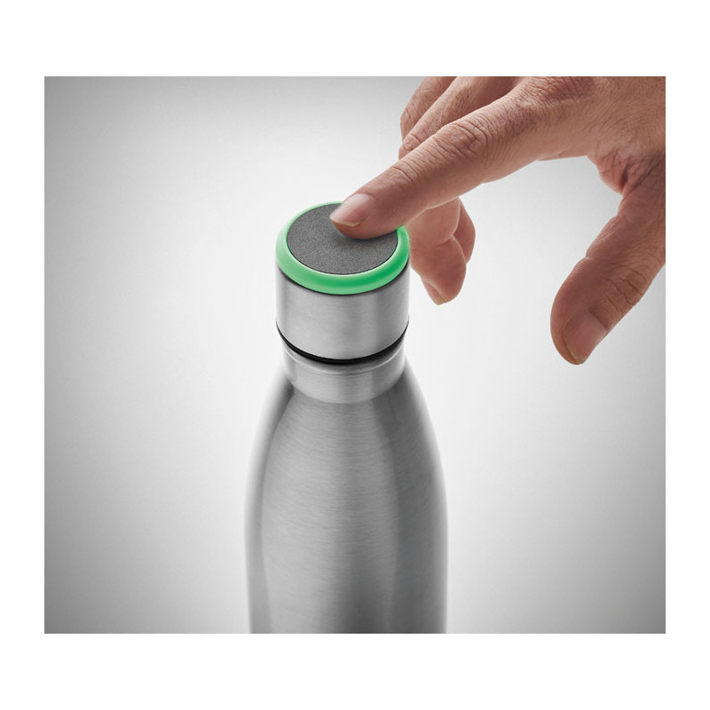 Botella de acero inoxidable doble pared con recordatorio de hidratación. La luz del sensor se enciende cada hora para recordarte cuándo es el momento de beber. Incluye 1 pila CR2032. Capacidad: 500 ml.