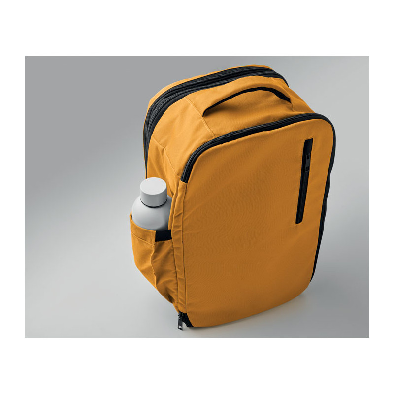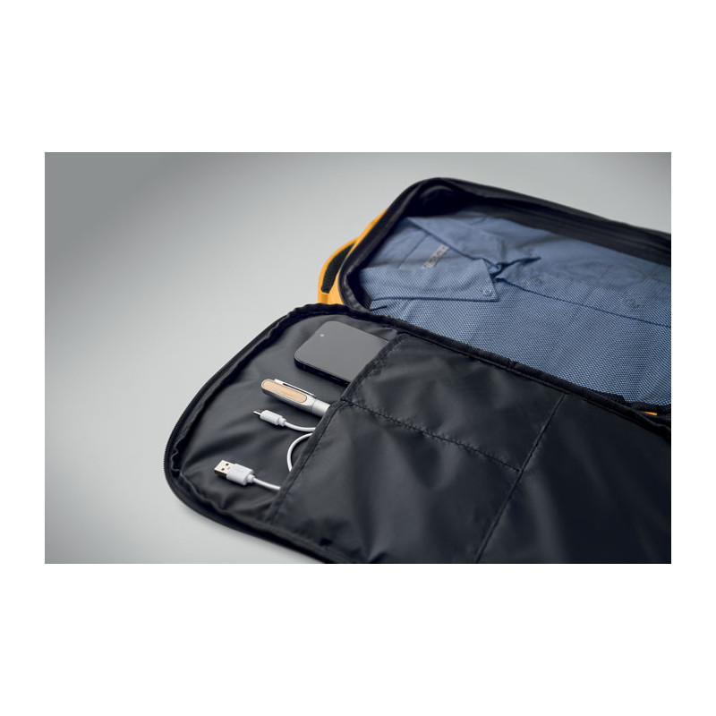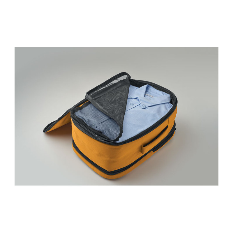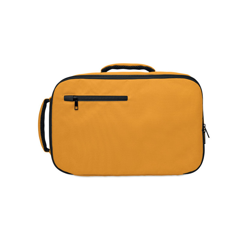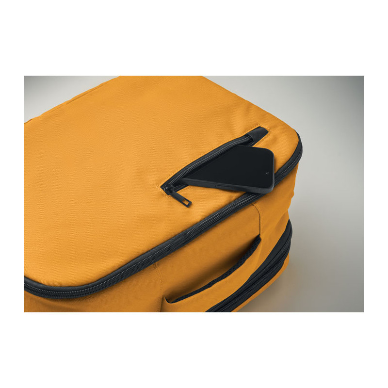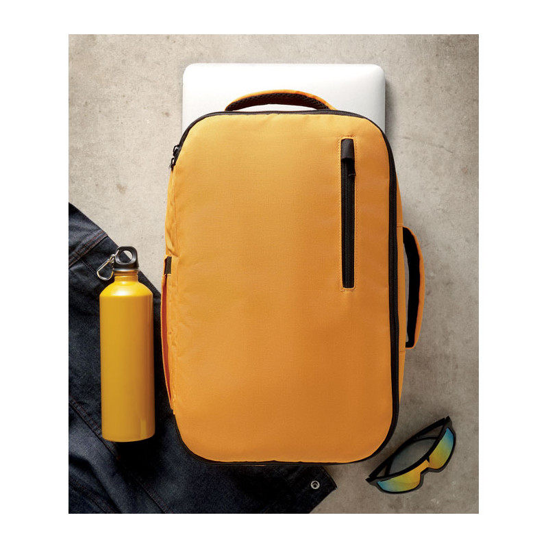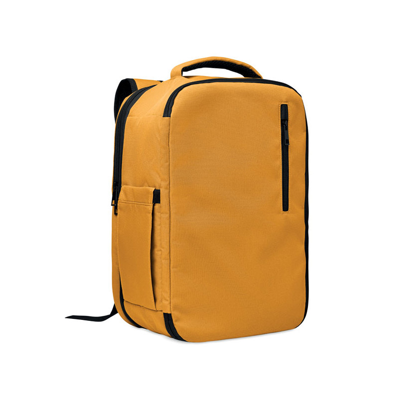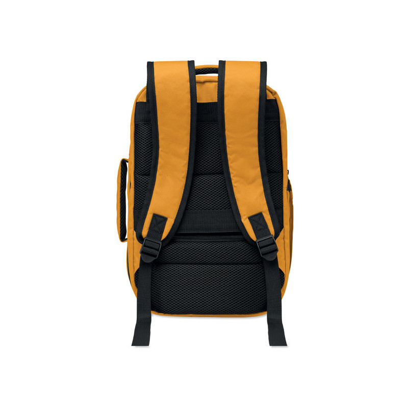 Mochila tamaño cabina en poliéster RPET 600D con apertura de 180º. Compartimento principal con dos secciones abiertas, división de malla, bolsillo acolchado para portátil de 15'' y correa para trolley.