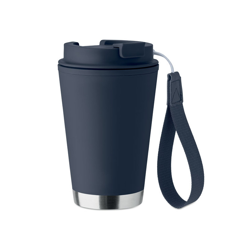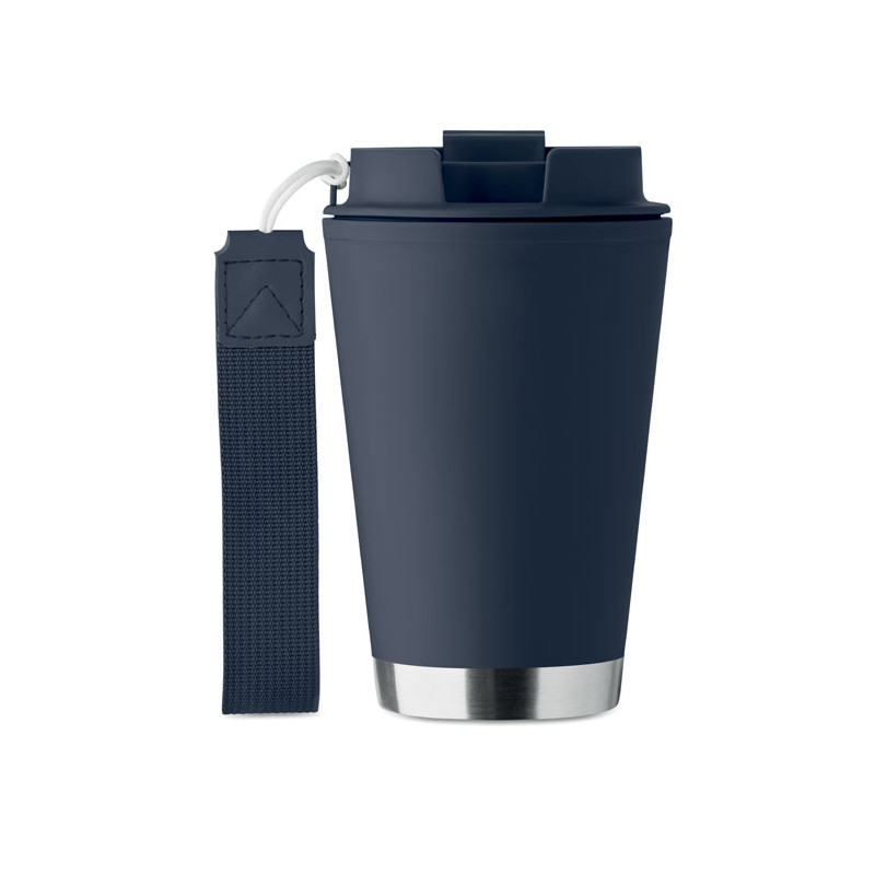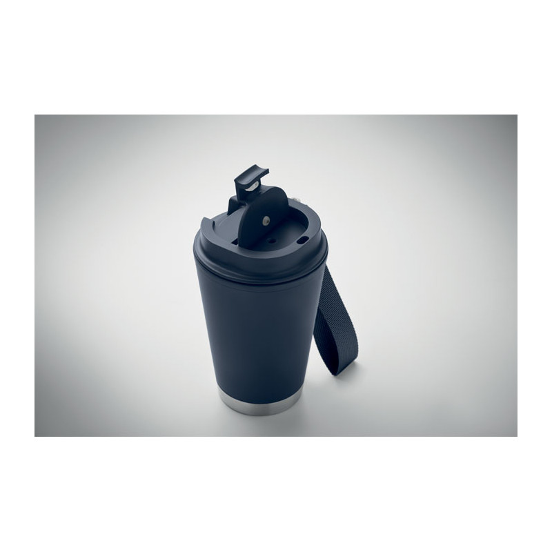 Vaso de doble pared con pared interior de PP, pared exterior de PP reciclado, detalle de acero inoxidable reciclado y correa de RPET. Capacidad: 300 ml.