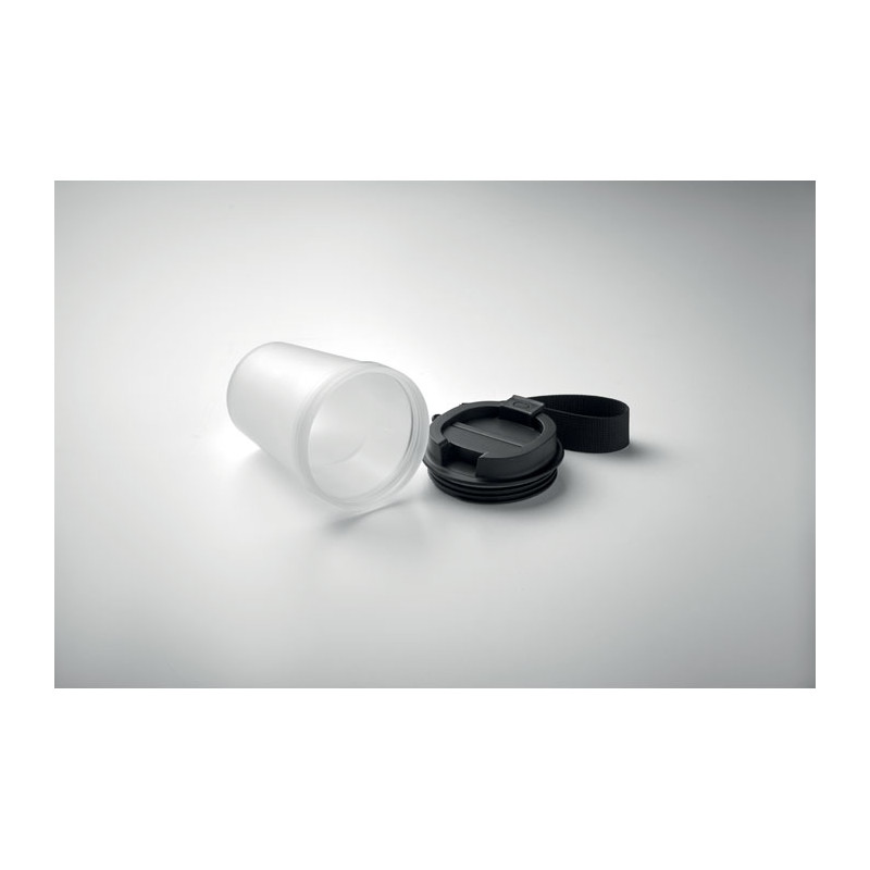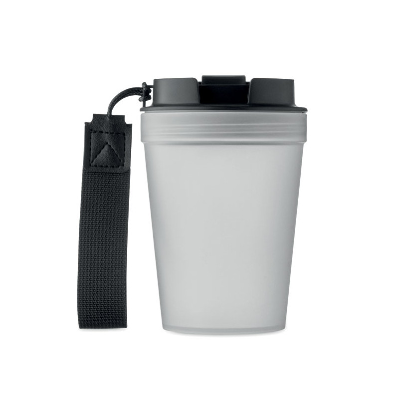 Vaso de pared simple de PP, con correa de poliéster RPET. Sin fugas. Capacidad: 300 ml. Al tratarse de un vaso de pared simple, puede producirse transferencia de calor.