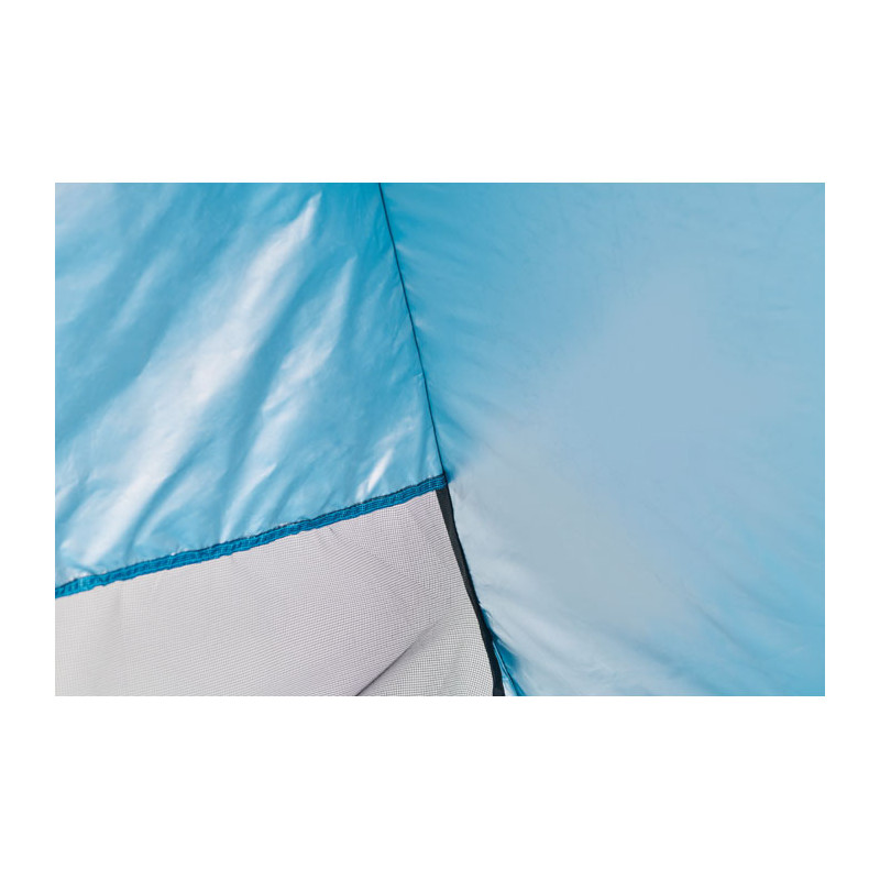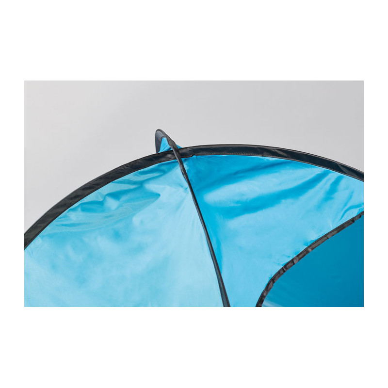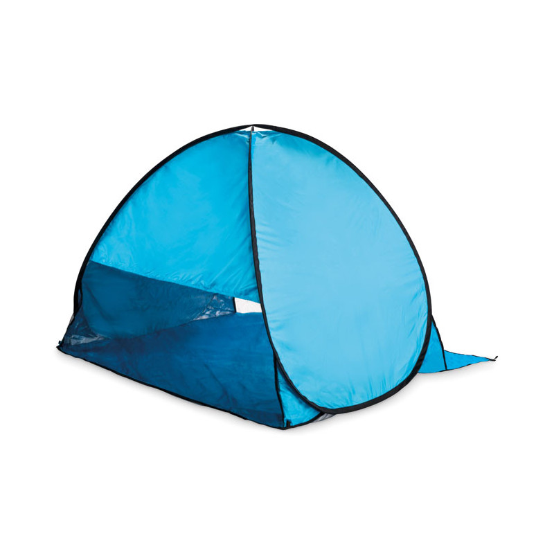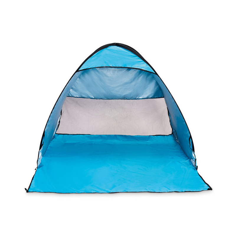 Two-person beach tent made of 190T polyester. Includes 6 steel hooks and a matching carry bag. Lightweight and easy to set up. Designed for shade and outdoor comfort.