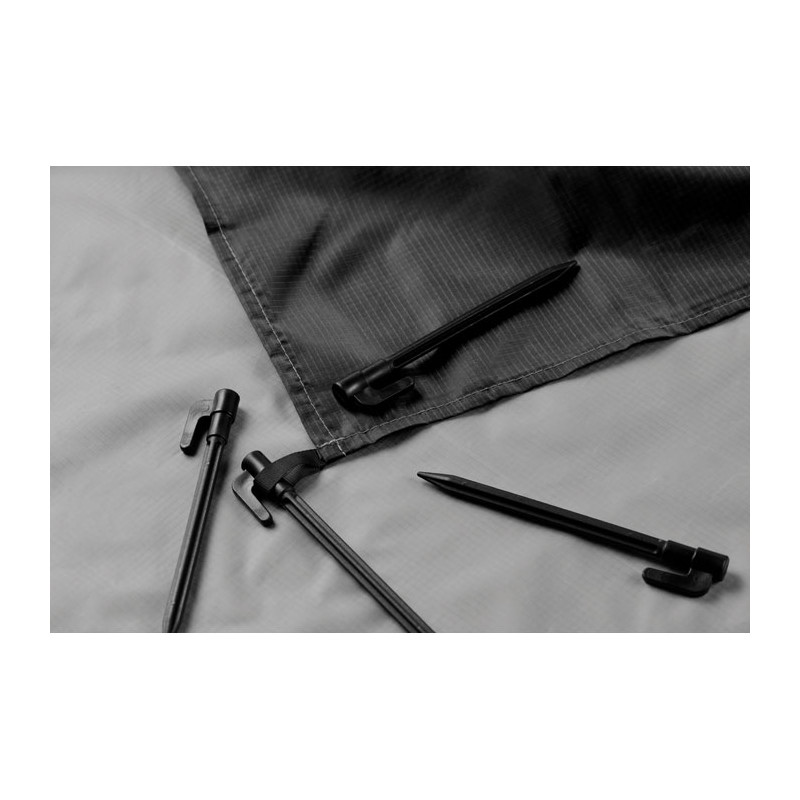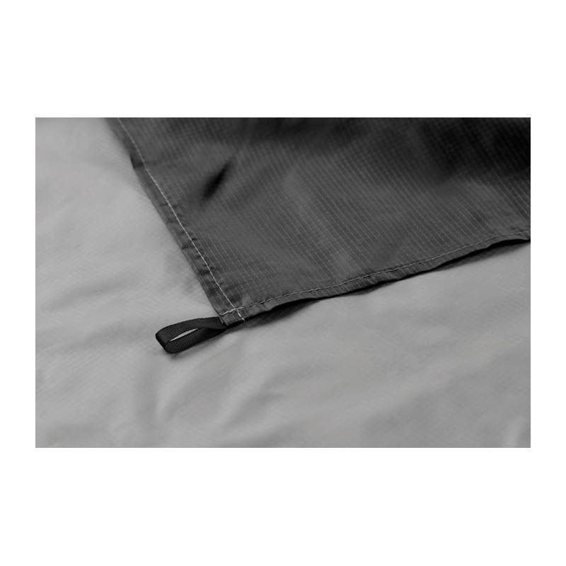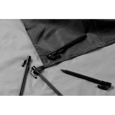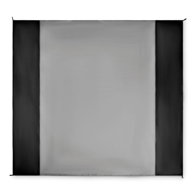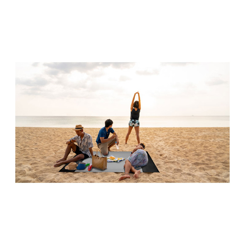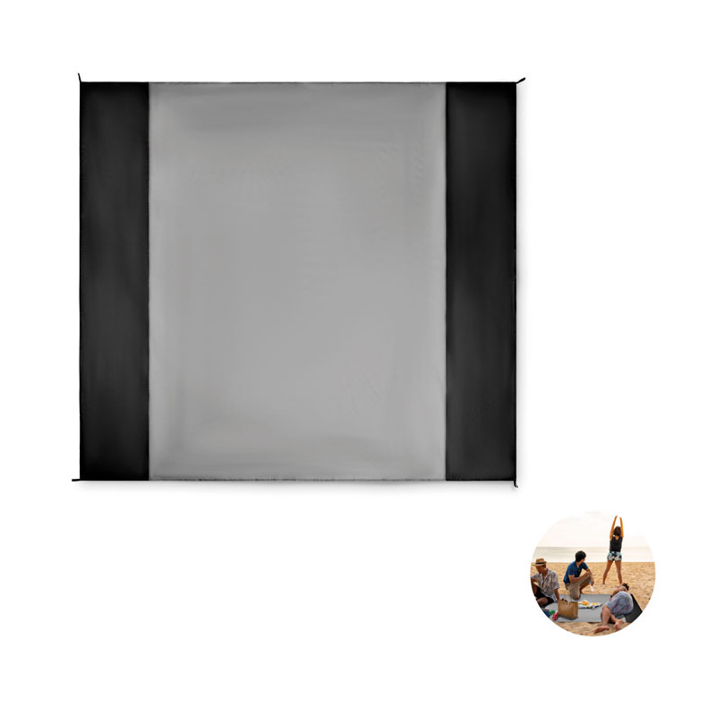 Lightweight beach mat in 210T polyester measuring 200x210cm. Includes 4 black hooks and a matching drawstring pouch for easy carrying.