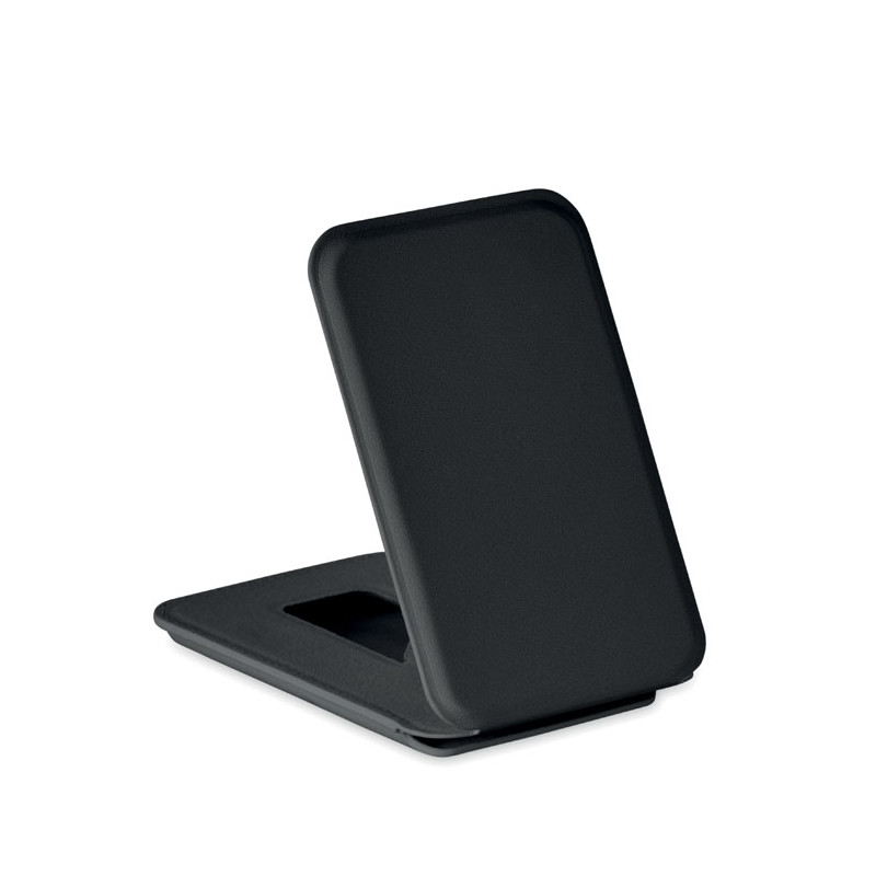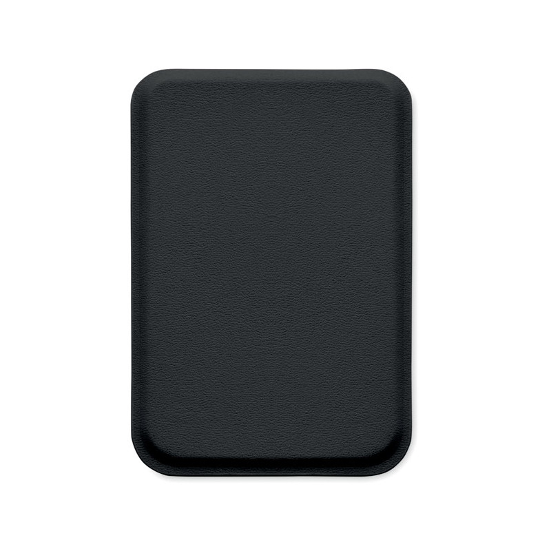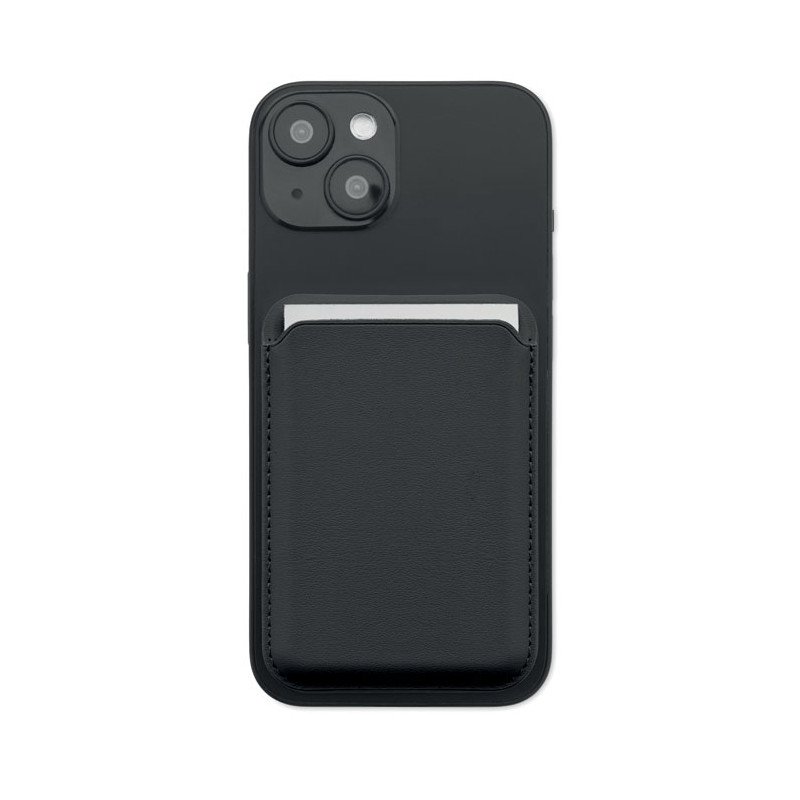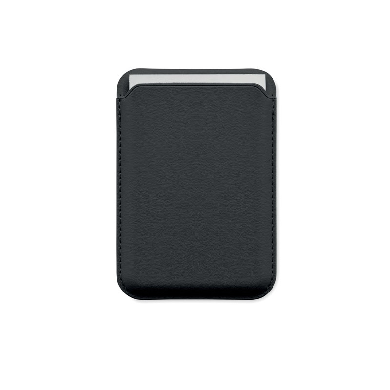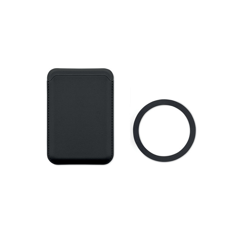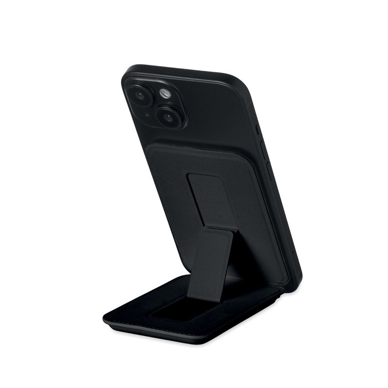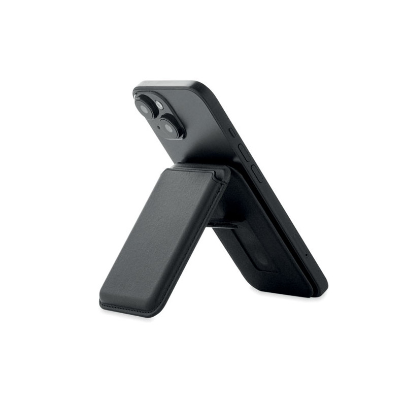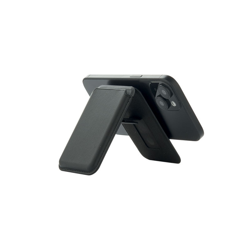 Magnetic PU leather credit card holder (for 3 cards) with stand functionality. It includes an additional metal ring.