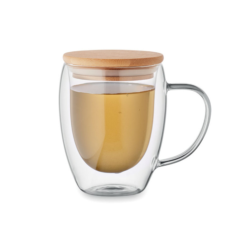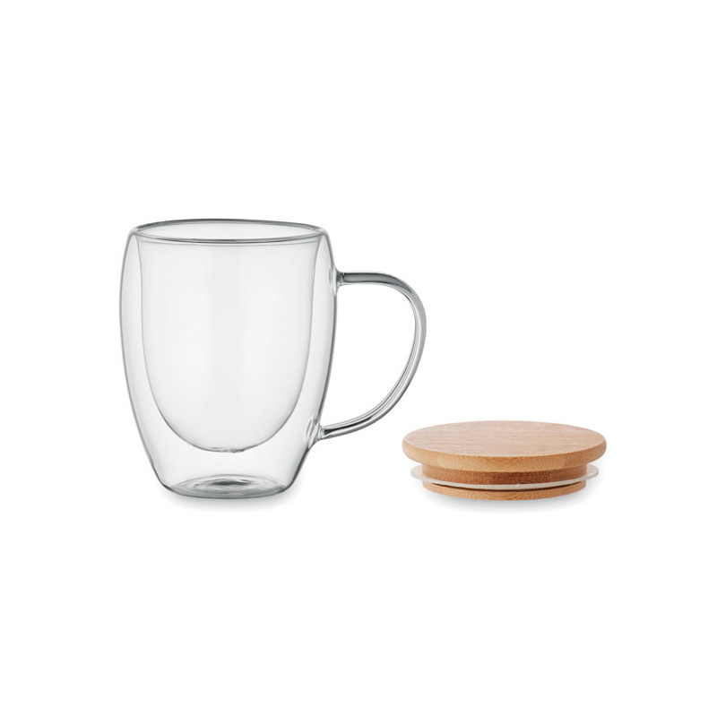 Double wall borosilicate glass mug with handle and bamboo lid. Capacity: 250 ml.
