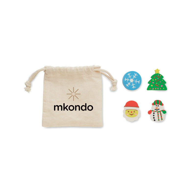 Set of 4 different Christmas erasers: snowflake, Santa, Christmas tree and snowman. Presented in cotton drawcord bag.
